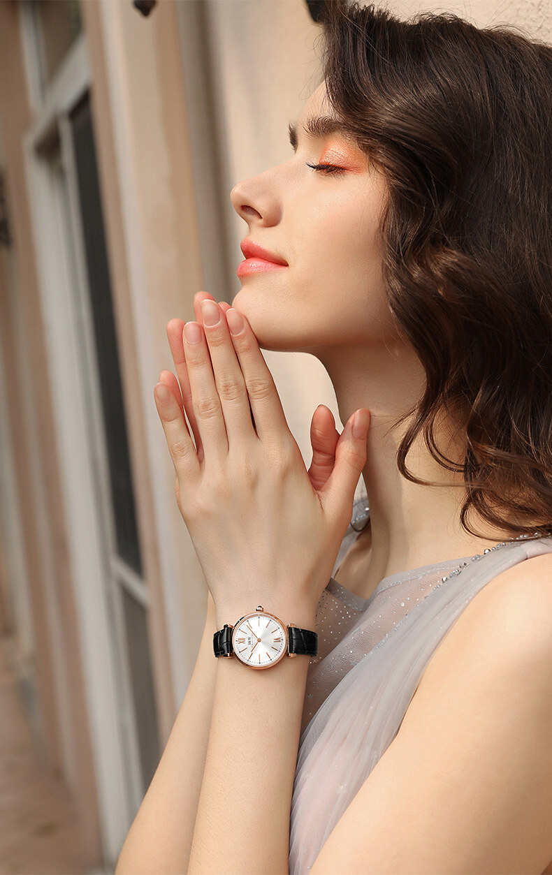 Dây da thật bền bỉ, thoáng mát khi sử dụng, đồng thời ôm trọn cổ tay thanh mảnh của nàng.