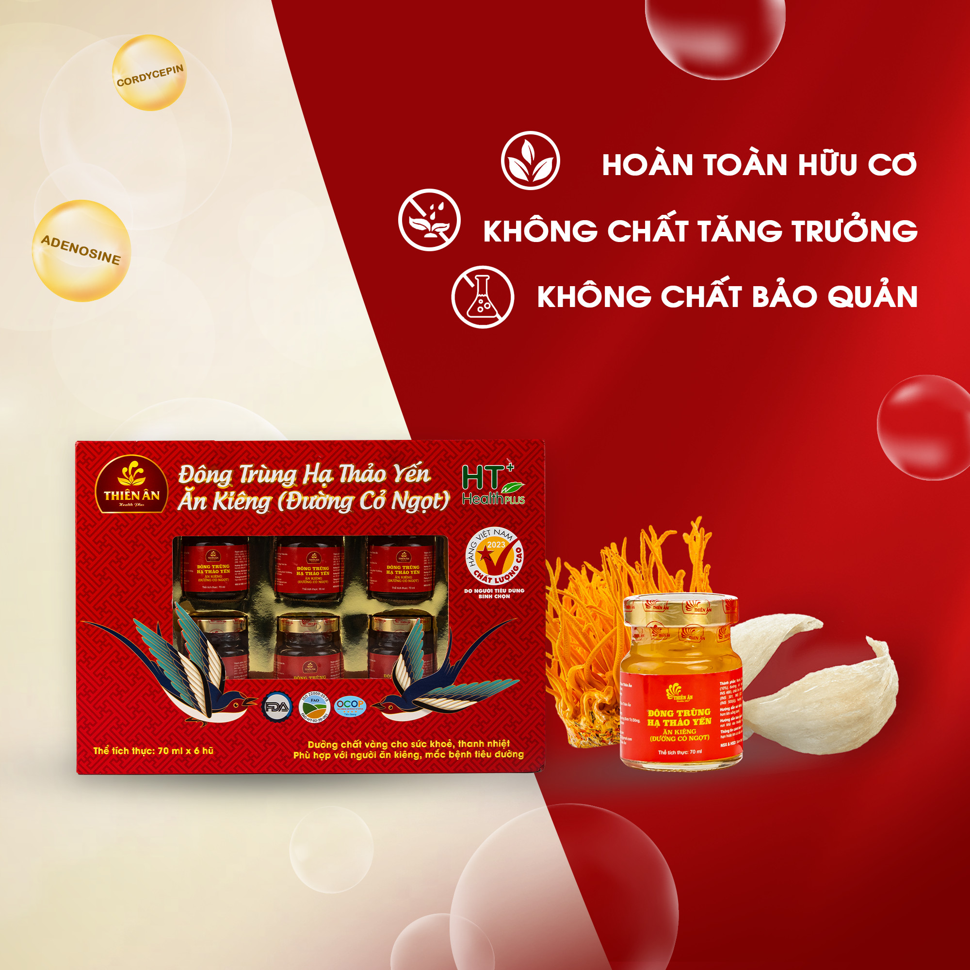 Mua tại TiktokĐông Trùng Hạ Thảo Yến Thiên Ânsử dụng nguyên liệu yến sào thật 100% kết hợp với hàm lượng đông trùng hạ thảo vượt trội lên đến 20%. Sản phẩm Đông Trùng Hạ Thảo Yến Thiên Ân vinh dự nhận được giấy chứng nhận OCOP 4 sao trao bởi Ủy Ban Nhân Dân Tỉnh Tiền Giang Sản phẩm được cấp chứng nhận ISO 22000:2018.