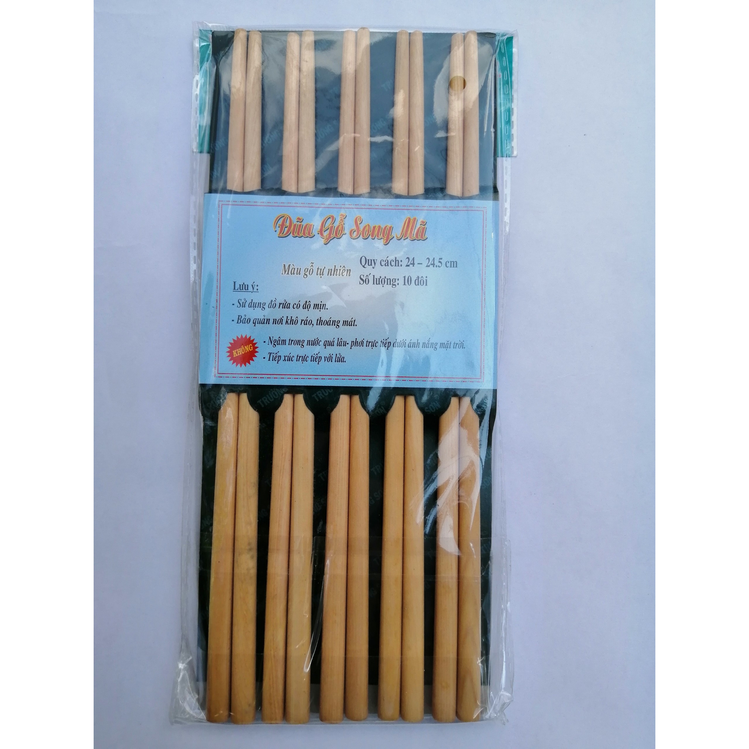 Tên sản phẩm: Đũa Gỗ Song Mã - thương hiệu Trường Sơn Kích thước đũa: 24 +/- 0.5 Cm Số lượng: 10 Đôi / Vỉ Trọng lượng: 100 gram