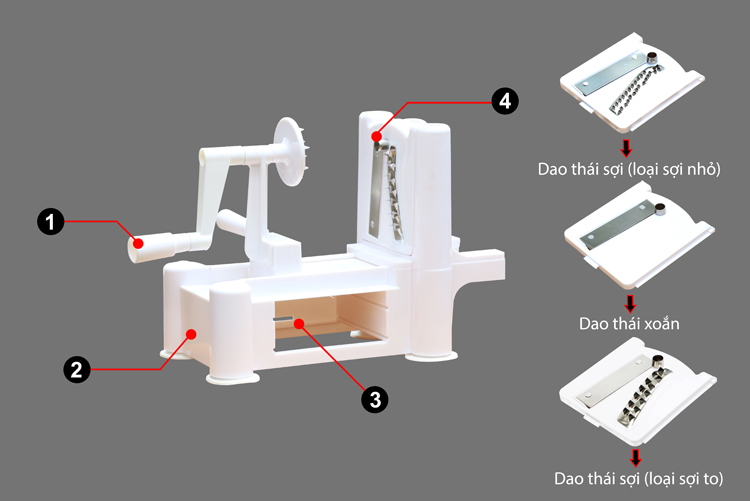 Với việc trang bị 3 khuôn dao dễ dàng thay đổi linh hoạt, người sử dụng có thể dễ dàng thái rau củ quả thành các sợi nhỏ rất dài dạng xoắn ốc hoặc dạng sợi thẳng. Tùy vào từng khuôn dao được sử dụng, người dùng có thể thu được sản phẩm có các kích thước sợi nhỏ, sợi dài dầy hơn hoặc sợi dạng dải ruy băng mỏng tiện lợi.