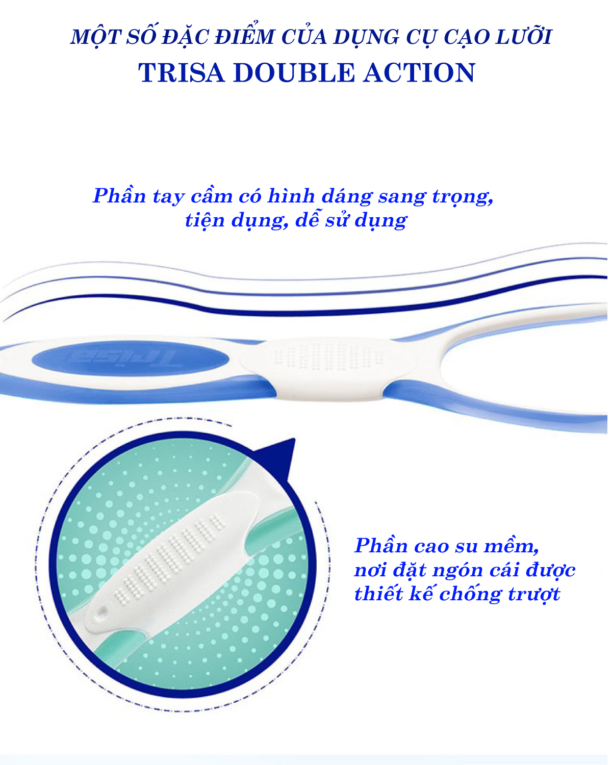 Mua tại TiktokLÀM SẠCH LƯỠI CÙNG TRISA DOUBLE ACTION Cạo Lưỡi Trisa Double Action được thiết kế theo hình dạng tự nhiên của lưỡi Phần cạo lưỡi có 2 dạng: Active Clean dùng để loại bỏ những mảng bám cứng đầu, Sensitive Clean làm sạch nhẹ nhàng kể cả những nơi nhạy cảm. Phần cao su mềm, nơi đặt ngón cái được thiết kế chống trượt Phần tay cầm có hình dáng sang trọng, tiện dụng. dễ sử dụng Chất lượng sản phẩm đã được kiểm nghiệm và được các nha sĩ khuyên dùng Hãy dùng kèm cạo lưỡi vào mỗi lần đánh răng để có được một hàm răng chắc khỏe, trắng sáng và hơi thở luôn thơm mát cả ngày nhé!