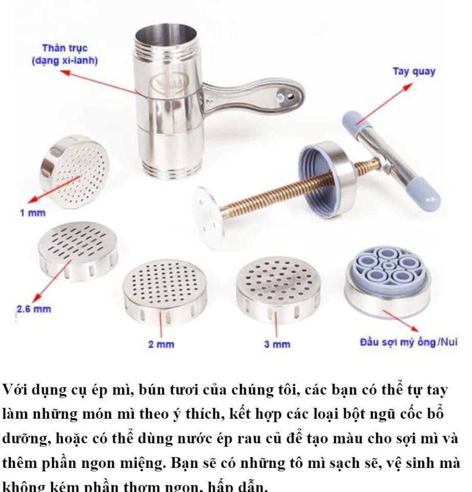 Mua tại TiktokDụng cụ làm bún tươi, mì được làm từ chất liệu inox cao cấp ít bám dầu mỡ, dễ rửa, không bị mốc, không độc hại. Sản phẩm có 2 đầu để làm sợi bún và mì. Bạn có thể tạo thành những sợi bún, mì đều tăm tắp với phần khuôn cố định sẵn. Dụng cụ không thể thiếu giúp cho các bà nội trợ có thể tự tay chế biến cho gia đình thưởng thức các món bún,mì thơm ngon, bổ dưỡng và an toàn. Kích thước: cao 18cm, ngang 15cm, đường kính 6cm. Trọng lượng 500gram