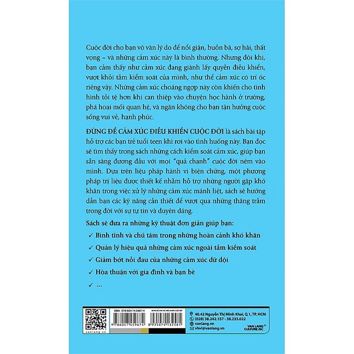 Đừng Để Cảm Xúc Điều Khiển Cuộc Đời "Cuộc đời cho bạn vô vàn lý do để nổi giận, buồn bã, sợ hãi, thất vọng – và những cảm xúc này là bình thường. Nhưng đôi khi, bạn cảm thấy như cảm xúc đang giành lấy quyền điều khiển, vượt khỏi tầm kiểm soát của mình, như thể cảm xúc có trí óc riêng vậy. Những cảm xúc choáng ngợp này còn khiến cho tình hình tồi tệ hơn khi can thiệp vào chuyện học hành ở trường, phá hoại mối quan hệ, và ngăn không cho bạn tận hưởng cuộc sống vui vẻ, hạnh phúc. Đừng Để Cảm Xúc Điều Khiển Cuộc Đời là sách bài tập hỗ trợ các bạn trẻ tuổi teen khi rơi vào tình huống này. Bạn đọc sẽ tìm thấy trong sách những cách kiểm soát cảm xúc, giúp bạn sẵn sàng đương đầu với mọi “quả chanh” cuộc đời ném vào mình. Dựa trên liệu pháp hành vi biện chứng, một phương pháp trị liệu được thiết kế nhằm hỗ trợ những người gặp khó khăn trong việc xử lý những cảm xúc mãnh liệt, sách sẽ hướng dẫn bạn các kỹ năng cần thiết để vượt qua những thăng trầm trong đời với sự tự tin và duyên dáng. Sách sẽ đưa ra những kỹ thuật đơn giản giúp bạn:
