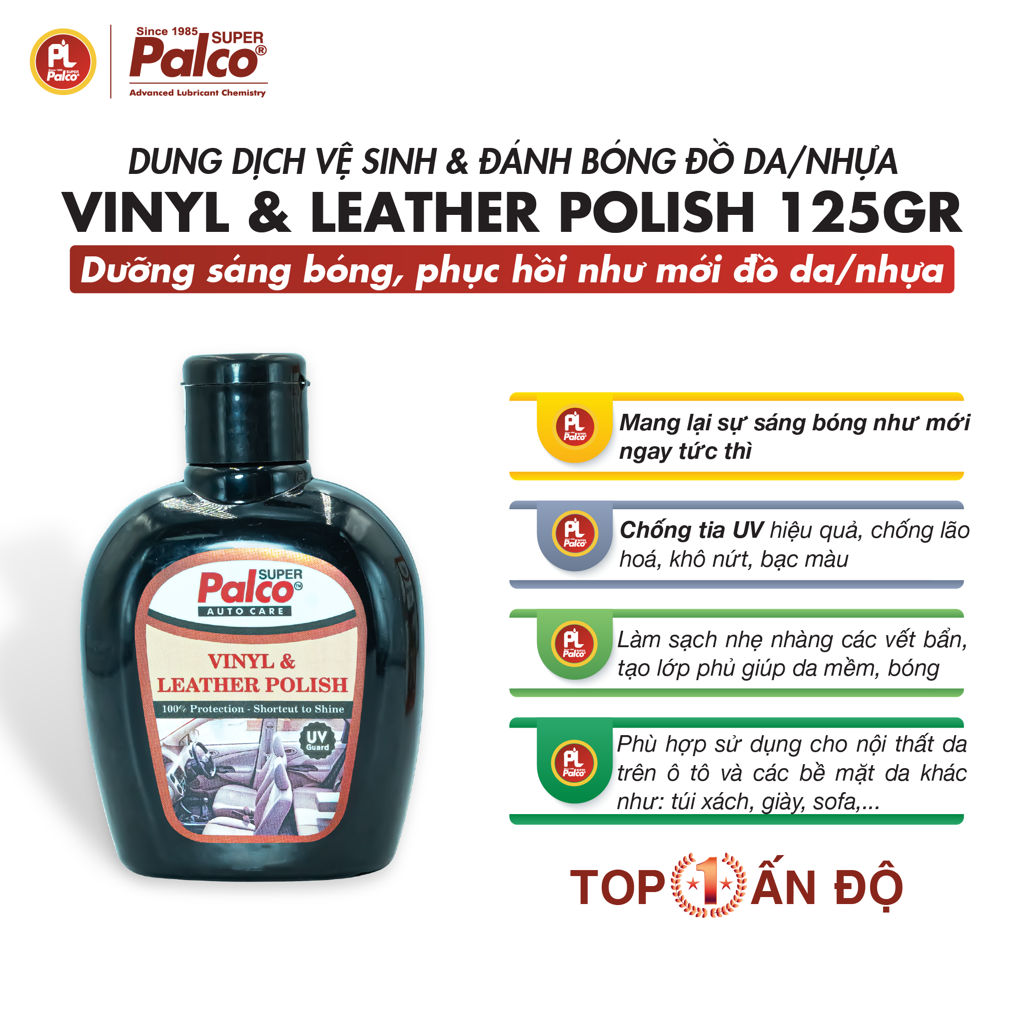 - Vệ sinh, khử mùi đồ da, khử khuẩn, chống nấm mốc, chống thấm nước và hạn chế bám bụi. KHUYẾN NGHỊ SỬ DỤNG: Phù hợp sử dụng trên các bề mặt da và giả da. Lý tưởng để tân trang, đánh bóng nội thất da ô tô; đồng thời ứng dụng phổ biến trong đời sống hàng ngày như đánh bóng sofa, bảo dưỡng túi da, quần áo da, giày dép da,… HƯỚNG DẪN SỬ DỤNG: Bước 1: Lau sạch bụi bẩn trên bề mặt da bằng khăn khô mềm hoặc bàn chải mềm. Bước 2: Lắc đều chai sản phẩm và cho một lượng vừa đủ lên bề mặt mút xốp. Bước 3: Chà nhẹ mút xốp lên bề mặt da theo vòng tròn để dung dịch thấm đều. Để khô trong 5 phút. Bước 4: Dùng bàn chải mềm hoặc mút đánh bóng để chà giúp tăng thêm độ bóng cho bề mặt da. LƯU Ý: Khi vừa đánh bóng xong có thể không cảm thấy da mềm ngay, tuy nhiên, sau khoảng 1 ngày sẽ cảm nhận rõ tác dụng của sản phẩm phát huy trên bề mặt da được đánh bóng. ĐÓNG GÓI: Chai 125g CẢNH BÁO & BẢO QUẢN: Lưu trữ ở nơi thoáng mát, không để trong môi trường quá 50 độ C. Tránh xa nguồn lửa. Để ngoài tầm với của trẻ em. VỀ THƯƠNG HIỆU PALCO Paras Lubricants được thành lập năm 1985 với trụ sở chính tại Mumbai, 1 văn phòng đại diện ở Tây Ấn và 2 nhà máy hiện đại đặt tại Khopoli và Daman. Đây là tập đoàn đã hoạt động 38 năm trên thị trường mỡ bò, dầu nhớt và sản phẩm chăm sóc xe với 2 thương hiệu chính, gồm: • PALCO Lubricants: chuyên về dầu nhớt và mỡ bôi trơn • PALCO Auto care: chuyên về sản phẩm chăm sóc xe Ngoài ra, tập đoàn còn hoạt động trong lĩnh vực thương mại với thương hiệu PALCO EXIM và GREENOIL. PALCO đạt tiêu chí quản trị sản xuất ISO 9001:2005 và tiêu chuẩn chất lượng sản phẩm quốc tế JASO và API. Sản phẩm PALCO rất nổi tiếng tại thị trường Ấn Độ về chất lượng. Đây là nhãn hiệu hàng đầu và được nhiều doanh nghiệp lớn sử dụng như: hãng hàng không Air India, Không quân India Air Force, hãng vận tải Container Corporation India, doanh nghiệp đường sắt Indian Railways, doanh nghiệp khai thác than Coal India, hiệp hội nông nghiệp Ấn Độ, Viện kỹ thuật quốc gia, Bộ quốc phò Thị trường xuất khẩu: Châu Úc, Mỹ Latin, Châu Phi và Việt Nam do SONAIMEX độc quyền phân phối.
