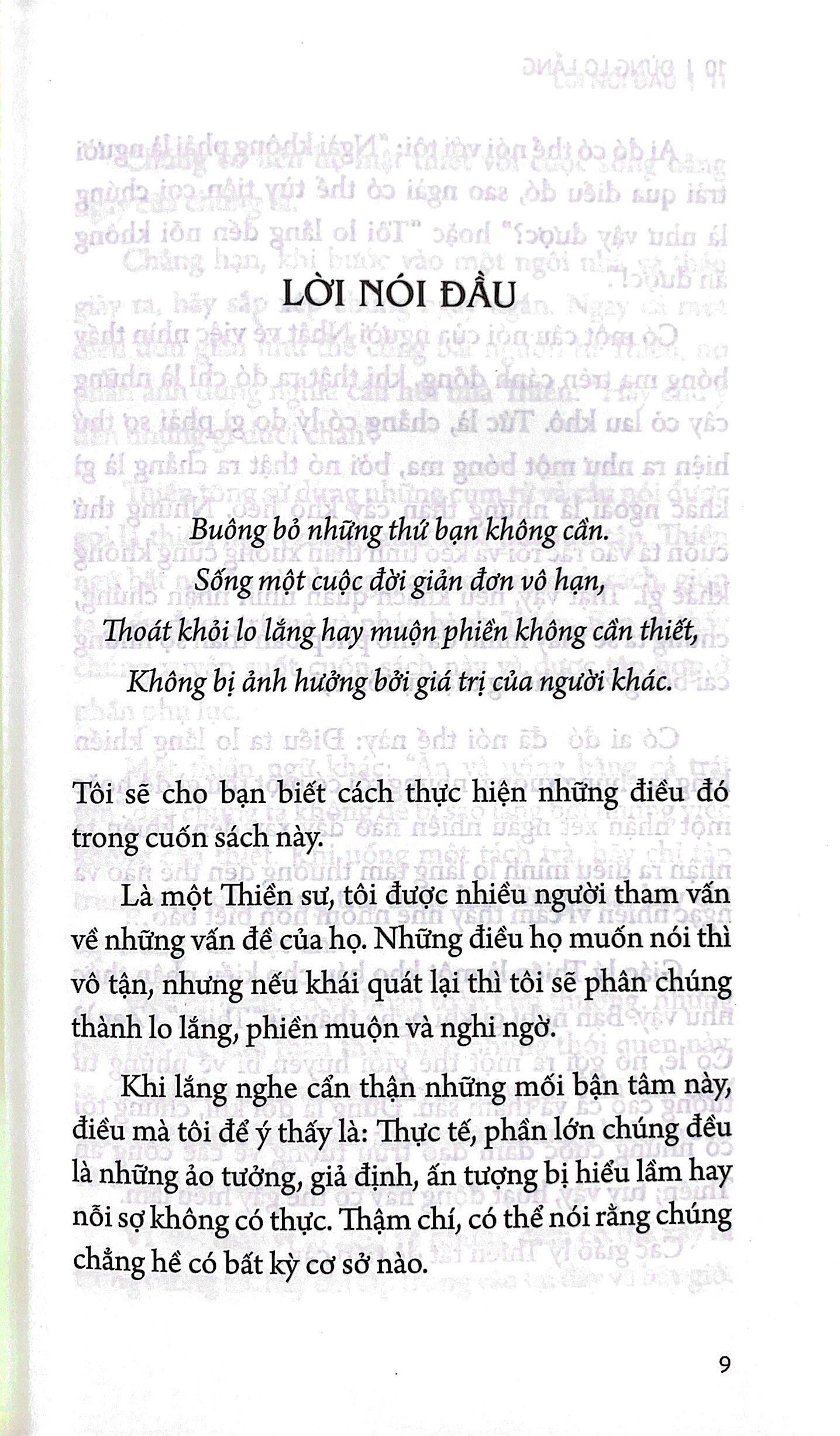 Ta lo lắng về một điều gì đó, nhưng rồi chợt nhận ra nó thật chẳng đáng lo đến vậy. Thật ra, 90% nỗi lo lắng của ta sẽ không thành hiện thực. Ta bỗng thấy nhẹ nhõm biết bao. Bí quyết ở đây là chỉ tập trung vào hiện tại và nơi này, như thế, ta có thể giải phóng m.ình khỏi những lo lắng không cần thiết, để tâm trí ta được bình yên. Thông qua cuốn sách này, SHUNMYO MASUNO sẽ cho ta biết tại sao.
