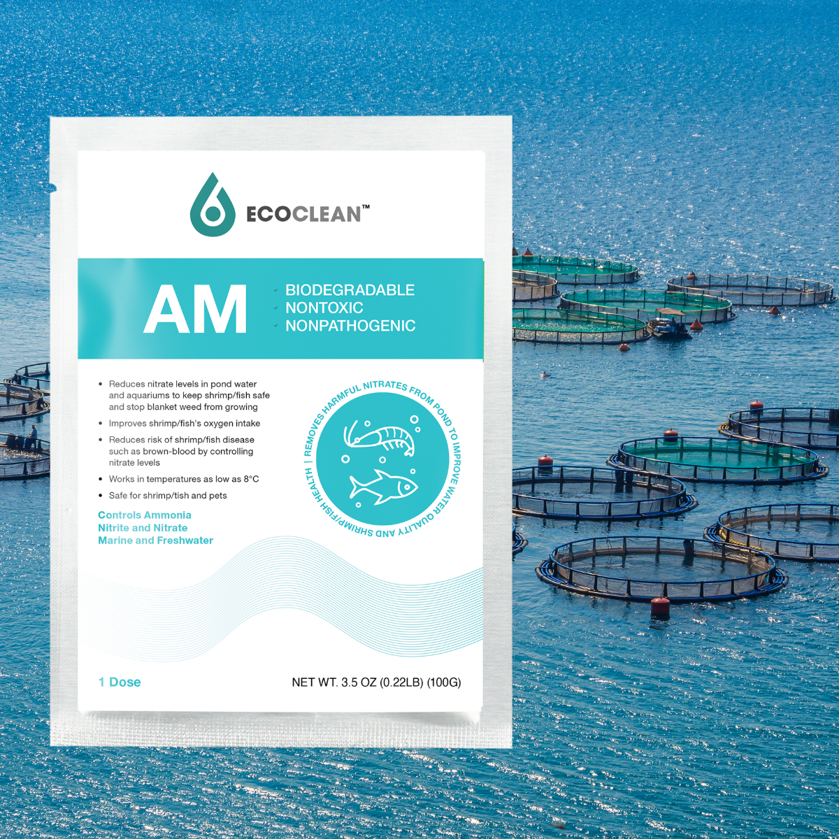 EcoClean AM là Men vi sinh được làm để chuyên xử lý khí độc, ổn định môi trường ao. Với các thành phần đặc biệt gồm có Nitrosomonas SP & Nitrobacter SP giúp chuyển hóa khí độc với cơ chế: NH3 (độc) sẽ được nhóm vi khuẩn Nitrosomonas sp chuyển hóa thành NO2, gọi là quá trình Nitrite hóa. NO2 - tiếp tục được nhóm vi khuẩn Nitrobacter sp chuyển hóa thành NO3, gọi là quá trình Nitrate hóa và đây là giai đoạn cuối của quá trình chuyển hóa.