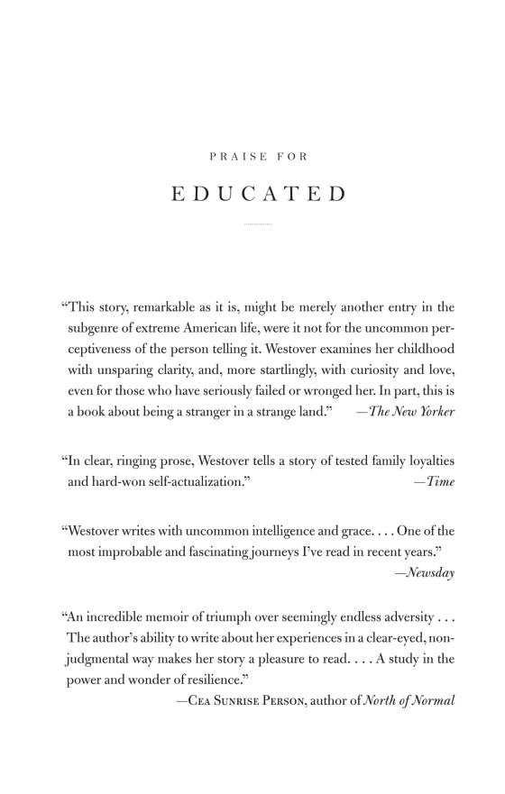 Born to survivalists in the mountains of Idaho, Tara Westover was seventeen the first time she set foot in a classroom. Her family was so isolated from mainstream society that there was no one to ensure the children received an education, and no one to intervene when one of Tara's older brothers became violent. When another brother got himself into college, Tara decided to try a new kind of life. Her quest for knowledge transformed her, taking her over oceans and across continents, to Harvard and to Cambridge University. Only then would she wonder if she'd traveled too far, if there was still a way home.