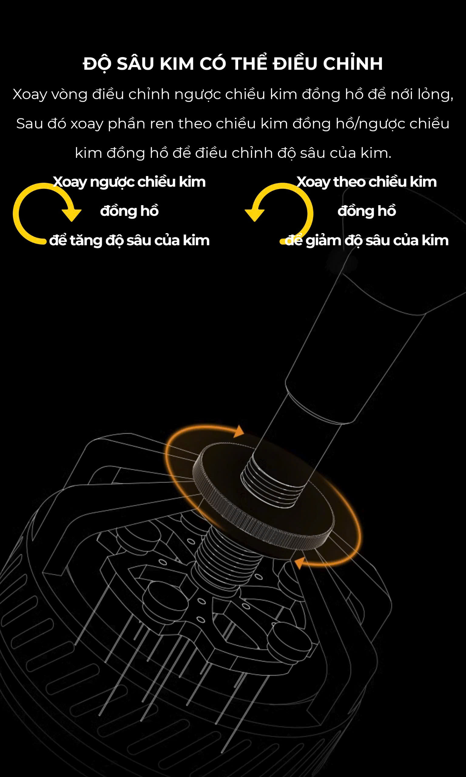 ️ Điều chỉnh độ sâu kim linh hoạt (18 - 22mm). Xoay ngược chiều kim đồng hồ để tăng độ sâu, xoay cùng chiều để giảm.