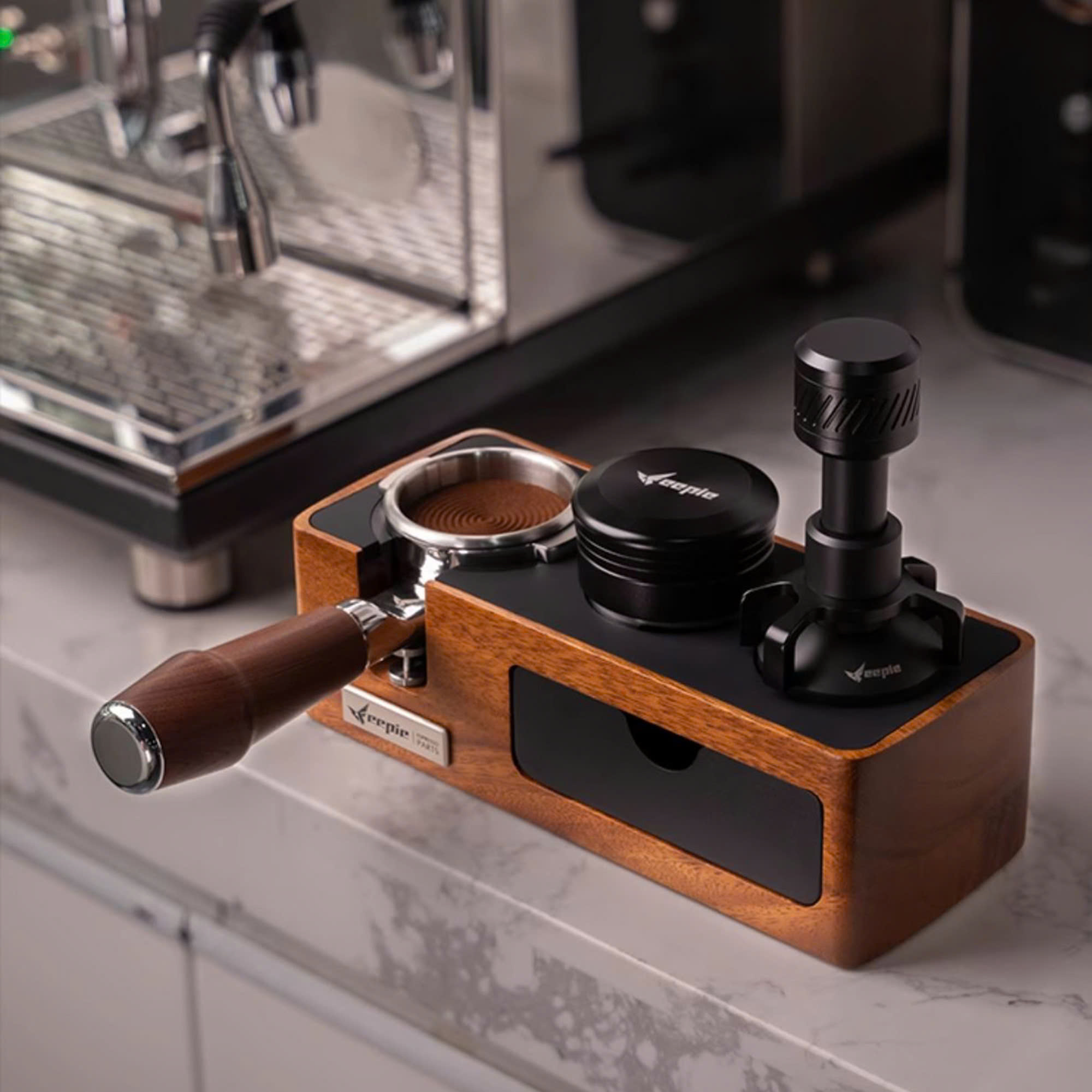 TAY CẦM ESPRESSO KHÔNG ĐÁY VÂN GỖ TỰ NHIÊN FEEPIE Sự kết hợp tuyệt vời giữa gỗ óc chó và nhựa cao cấp mang đến cho bạn trải nghiệm pha chế espresso đẳng cấp. Tay
