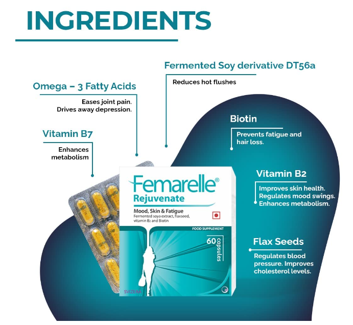 - Femarelle Rejuvenate (phụ nữ từ 40 đến 49 tuổi) giúp chuyển hóa, tăng năng lượng, hỗ trợ giảm mệt mỏi, tăng độ đàn hồi của da, giúp tóc khỏe, cải thiện giấc ngủ, cảm xúc, do thiếu hụt estrogen trong giai đoạn chuyển tiếp từ còn kinh sang mãn kinh. Khi một phụ nữ đến tuổi 40, buồng trứng còn rất ít nang noãn. Do đó, sự rụng trứng xảy ra ít thường xuyên hơn, làm nồng độ estrogen bắt đầu suy yếu, dẫn đến kinh nguyệt không đều. Trong giai đoạn chuyển tiếp giữa tuổi sinh sản sang tuổi mãn kinh, nồng độ hormon dao động và suy yếu, góp phần đáng kể vào sự mất cân bằng về thể chất, tinh thần và cảm xúc. Các triệu chứng đôi khi giống với triệu chứng PMS (hội chứng tiền kinh nguyệt), tuy nhiên chúng có thể kéo dài hơn và nghiêm trọng hơn trong giai đoạn này. Tính khí thất thường, thiếu năng lượng, rối loạn giấc ngủ, da khô và rụng tóc chỉ là một vài trong số các triệu chứng có liên quan đến việc thiếu hụt estrogen. Mặc dù các triệu chứng khác nhau giữa những người phụ nữ, nhưng nhìn chung đều ảnh hưởng xấu đến chất lượng cuộc sống. CÁC NGHIÊN CỨU CHỈ RA RẰNG FEMARELLE REJUVENATE MANG LẠI TINH THẦN YÊU ĐỜI, KHOẺ MẠNH, HẠNH PHÚC, TRÀN ĐẦY SỨC SỐNG VÀ CẢI THIỆN TÍNH KHÍ NGAY TRONG THÁNG ĐẦU TIÊN SỬ DỤNG. FEMARELLE REJUVENATE GIÚP: