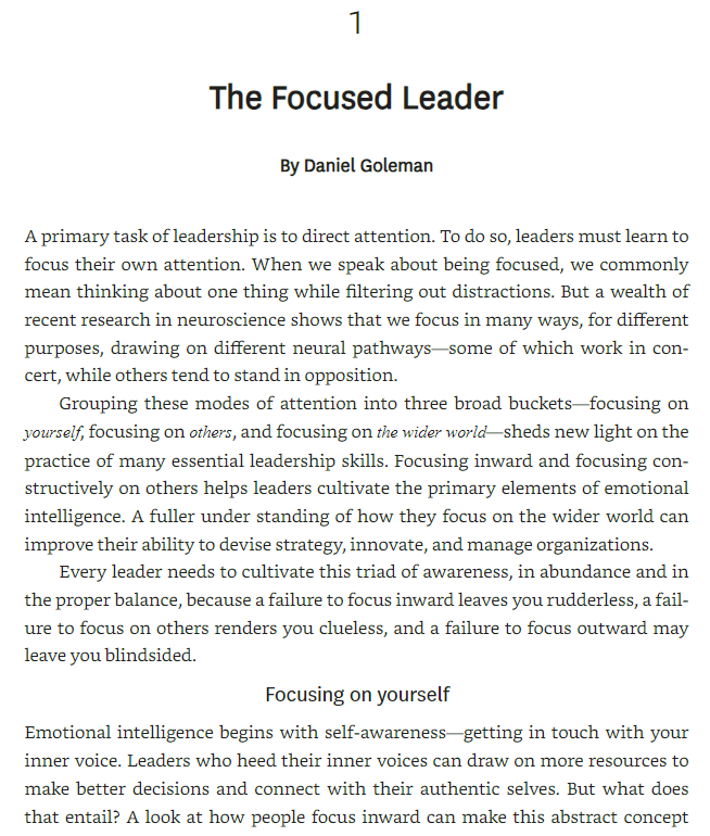 Focus (HBR Emotional Intelligence Series) The importance of achieving focus goes well beyond your own productivity. Deep focus allows you to lead others successfully, find clarity amid uncertainty, and heighten your sense of professional fulfillment.