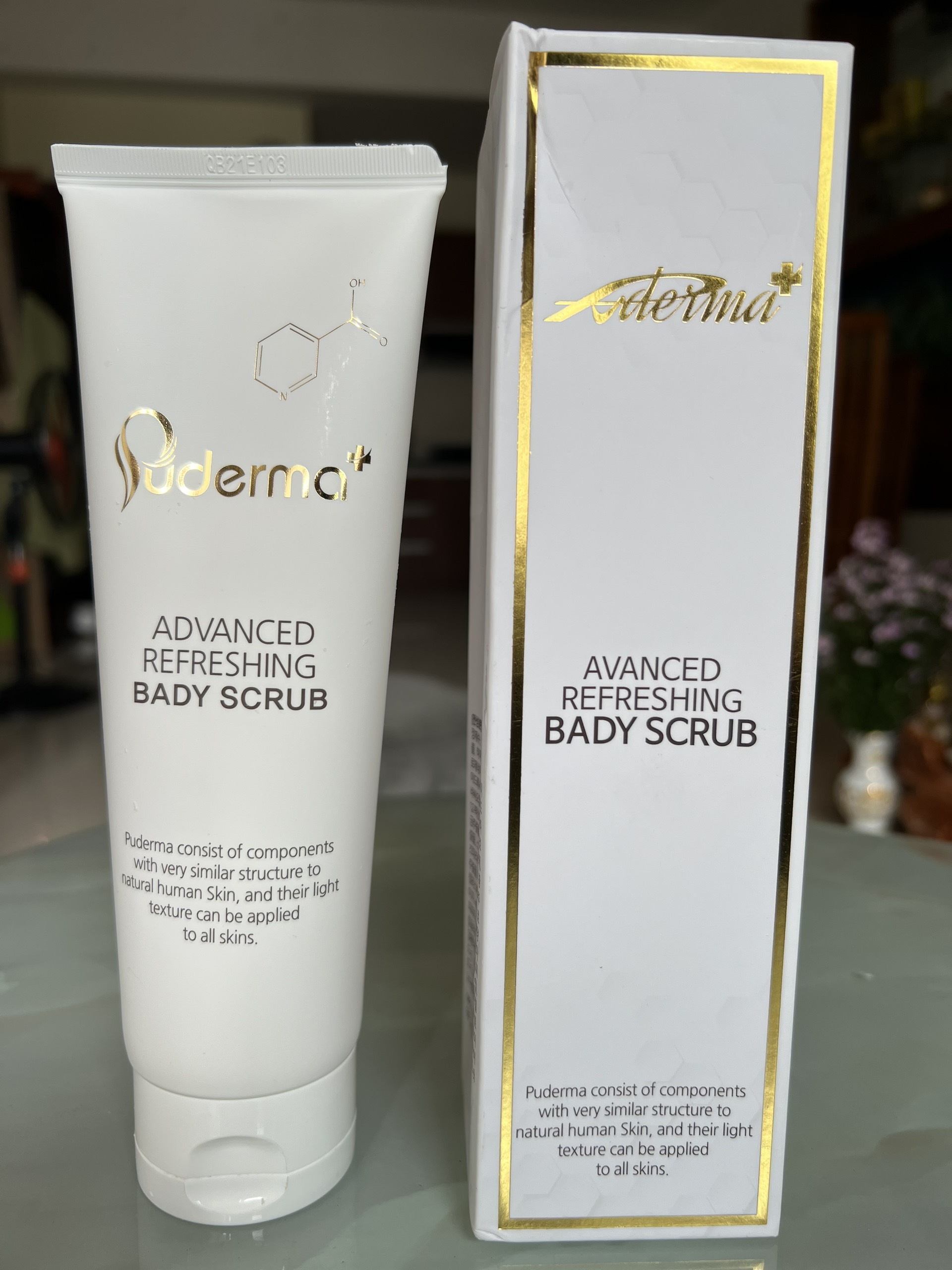 - Lấy 1 lượng vừa đủ Tẩy da chết toàn thân Puderma Advanced Refreshing Bady Scrub tản đều toàn thân. Vỗ nhẹ cho kem thẩm thấu, sau đó massage da khoảng 1 ~2 phút. Sau đó tắm lại với nước sạch. Thành phần chính của Tẩy Da Chết Toàn Thân Body PUDERMA ADVANCED REFRESHING BADY SCRUB (dùng cho toàn thân): Water, Niacinamide, PEG-8, Glycerin, Cellulose, Oryza Sativa (Rice) Bran Water, Carbomer, Arginine, PEG-40 Hydrogenated Castor Oil, Chlorphenesin, Butylene Glycol, Microcrystalline Cellulose, Glycyrhiza Glabra (Licorice) Root Extract, Zingiber Officinale (Ginger) Root Extract, Schisandra Chinensis Fruit Extract, Coptis Japonica Root Extract, Camellia Sinensis Leaf Extract, Allantoin, 1,2-Hexanediol, Avena Sativa (Oat) Meal Extract, Oryza Sativa (Rice) Extract, Sesamum Indicum (Sesame) Seed Extract, Vigna Radiata Seed Extract, Propolis Wax, Caprylyl Glycol, Simmondsia Chinensis (Jojoba) Seed Oil Prunus Amygdalus Dulcis (Sweet Almond) Oil, Macadamia Ternifolia Seed Oil, Oryza Sativa (Rice) Bran Extract, Asiaticoside, Sodium Hyaluronate, Disodium EDTA, Fragrance Cam kết: