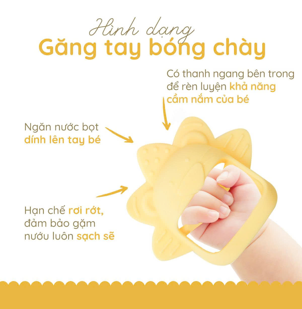 Gặm nướu cho bé từ sơ sinh SILIPOT BEBE mềm, chất liệu platinum silicone, an toàn cho bé, không BPA, chịu nhiệt 250 độ   Thông Tin Sản Phẩm: - Chất liệu: 100% Silicone y tế cao cấp (Platinum Silicone) - Xuất xứ: Hàn Quốc - Đối tượng: Bé từ 3 tháng tuổi trở lên - Màu sắc: Trong suốt - Hồng - Vàng - Tiêu chuẩn: Không BPA  -  An toàn thực phẩm -  FDA - LFGB   Tại Sao Mẹ Nên Chọn Gặm Nướu Vòng Tay Silipot Bebe? 1. Thiết kế: - Gặm nướu Silipot Bebe có hình dáng vòng tay vừa vặn bàn tay nhỏ xíu của bé, hạn chế rơi mất, hỗ trợ phát triển khả năng cầm nắm sớm. - Gặm nướu Silicone có hình dáng con vật đáng yêu, nhiều màu sắc, kích thích giác quan. 2. Chất liệu: - Gặm nướu hình găng tay bóng chày có chất liệu Silicone Platinum cao cấp, mềm mại và an toàn cho bé. 3. Công dụng: - Gặm nướu có tác dụng giúp xoa dịu cơn đau nướu của bé, hỗ trợ massage nhẹ nhàng khi bé mọc răng, giúp bé ít quấy khóc, ngủ ngon hơn. 4. Vệ sinh & Bảo quản: - Gặm nướu có thể tiệt trùng bằng nước sôi, máy tiệt trùng, máy rửa chén (ngăn trên). - Không biến dạng, không bám mùi thực phẩm.   Chính sách: - Khi nhận hàng, mẹ hãy quay lại video khui hàng. Nếu đơn hàng có vấn đề từ nhà sản xuất, Aladdin Vina sẽ hỗ trợ mẹ đổi trả ngay.  - Nếu nhận hàng chưa được ưng ý, mẹ đừng vội đánh giá mà hãy nhắn tin ngay cho Aladdin Vina để được hỗ trợ nhanh nhất mẹ nhé.    Giới thiệu về AladdinVina: -  Aladdin Vina chuyên phân phối sản phẩm cao cấp cho mẹ và bé, cam kết mang đến giải pháp chăm sóc toàn diện – an toàn – thông minh cho bé yêu trong những năm tháng đầu đời. - Đối tác phân phối chính hãng của nhiều thương hiệu uy tín từ Hàn Quốc và châu Âu.