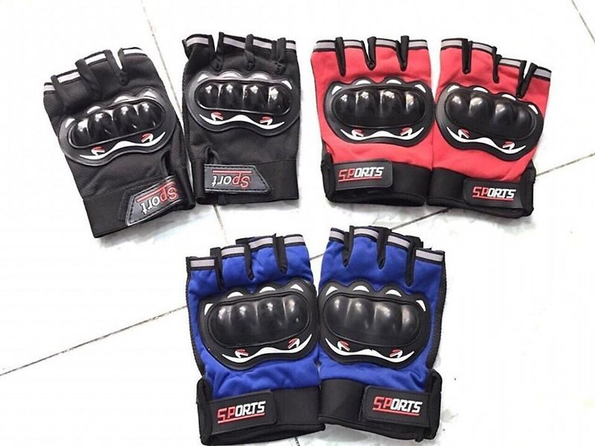Găng tay hở ngón dành cho người đi moto - xe máy Chất liệu: Vải Airmesh, gù nhựa cứng, da lộn, lòng bàn tay có hạt cao su tăng độ bám Loại găng hở ngón