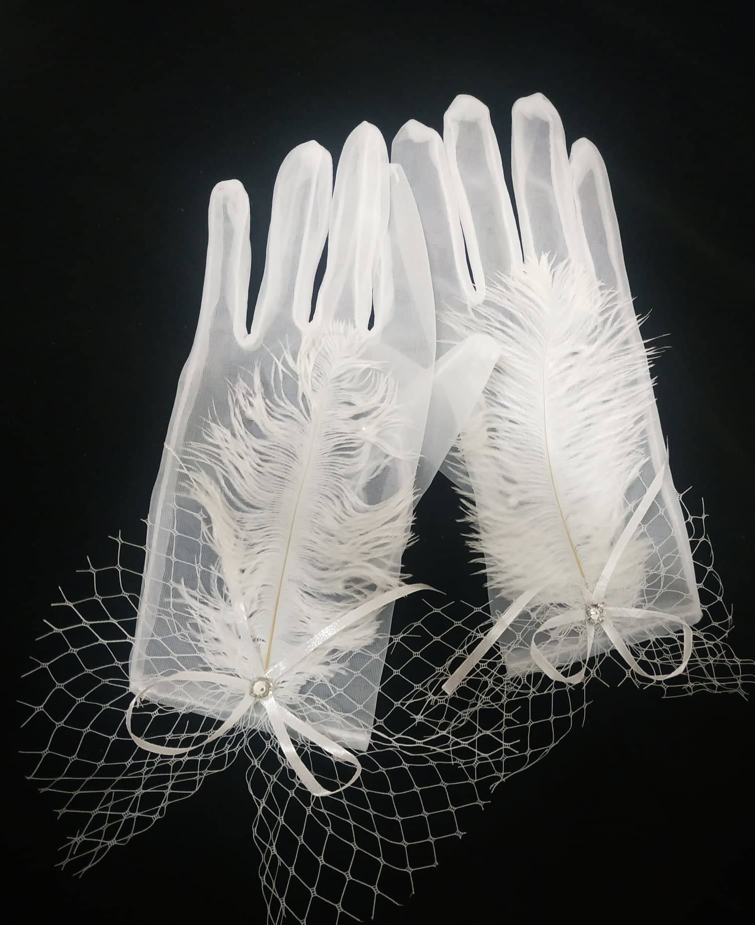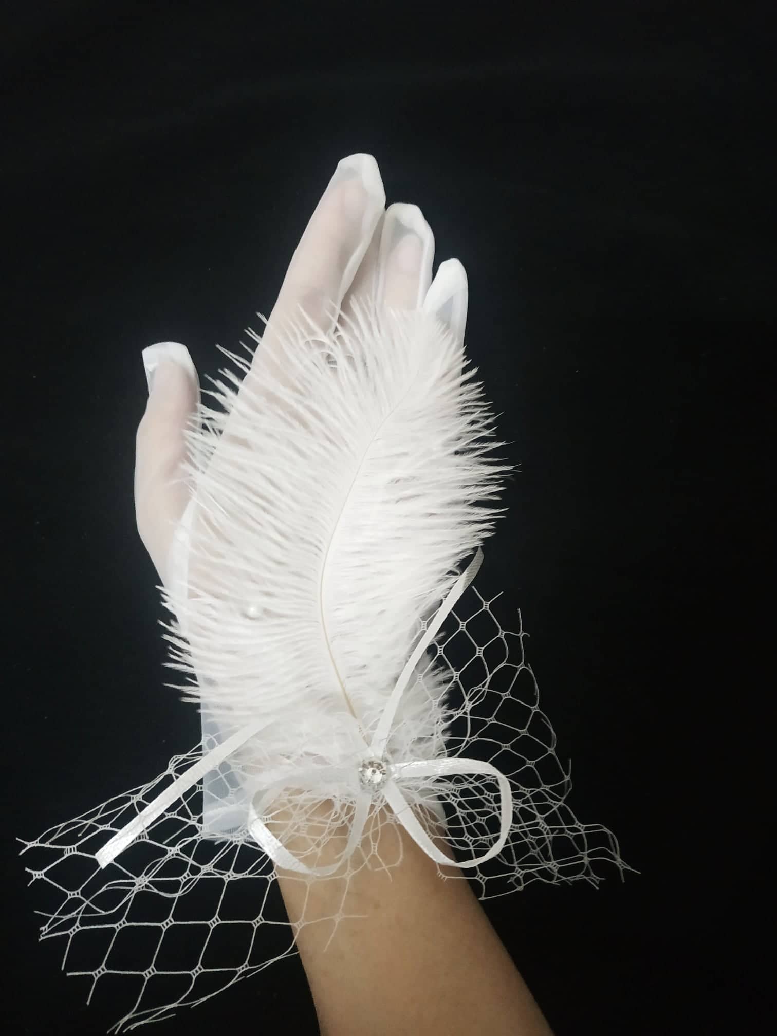✨Găng tay trong suốt đính lông vũ, ngọc trai và ren lưới cho Cô dâu và Dạ hội, đi tiệc, sự kiện, lễ hội, chụp ảnh MS: 43750