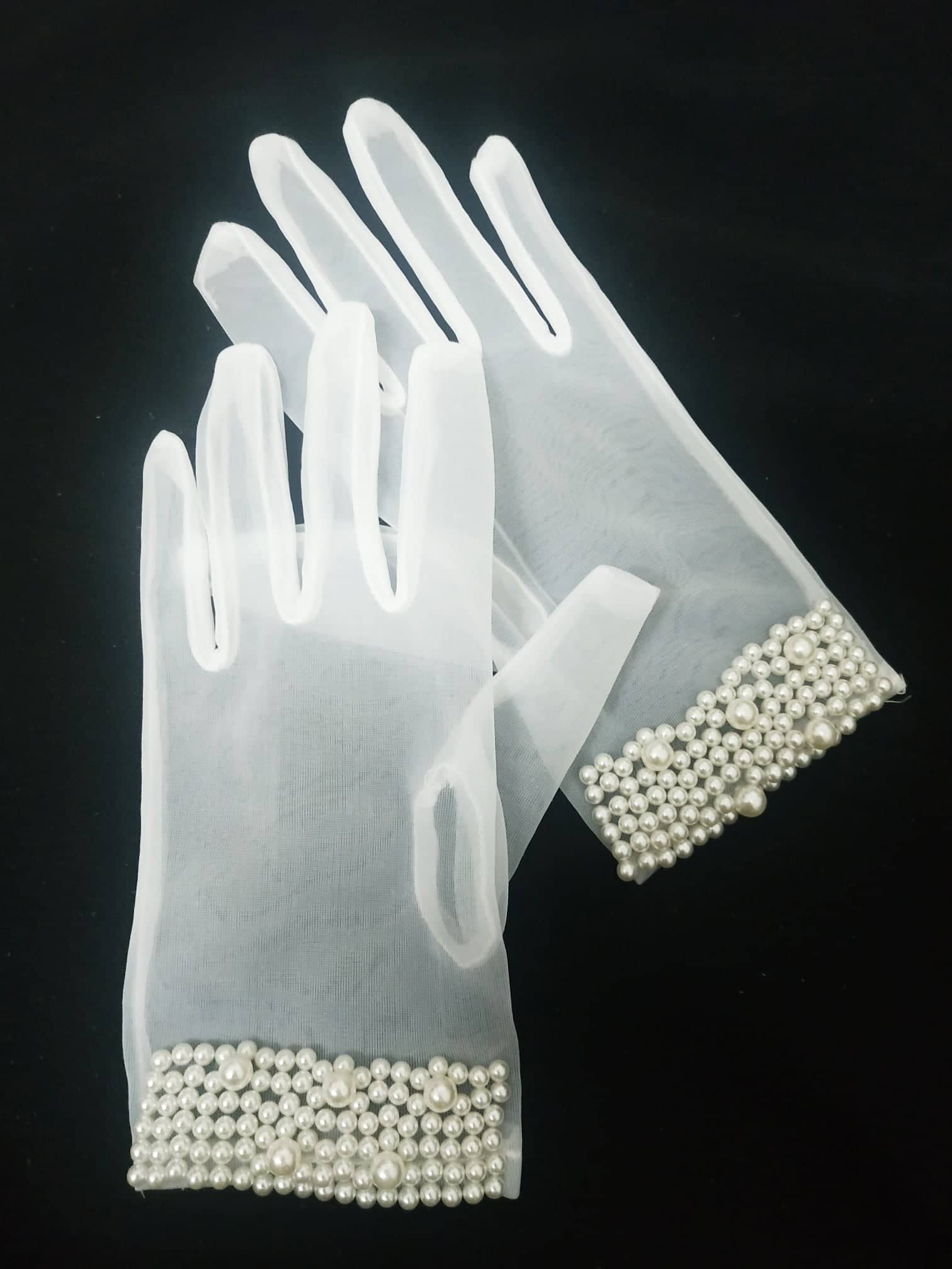 Găng tay Cô dâu và Dạ hội, đi tiệc, sự kiện, lễ hội, chụp ảnh MS: 43445 Chất liệu: tuyn mềm. Kiểu dáng: bao kín ngón, trong suốt, tạo kiểu và đính hạt trai ở