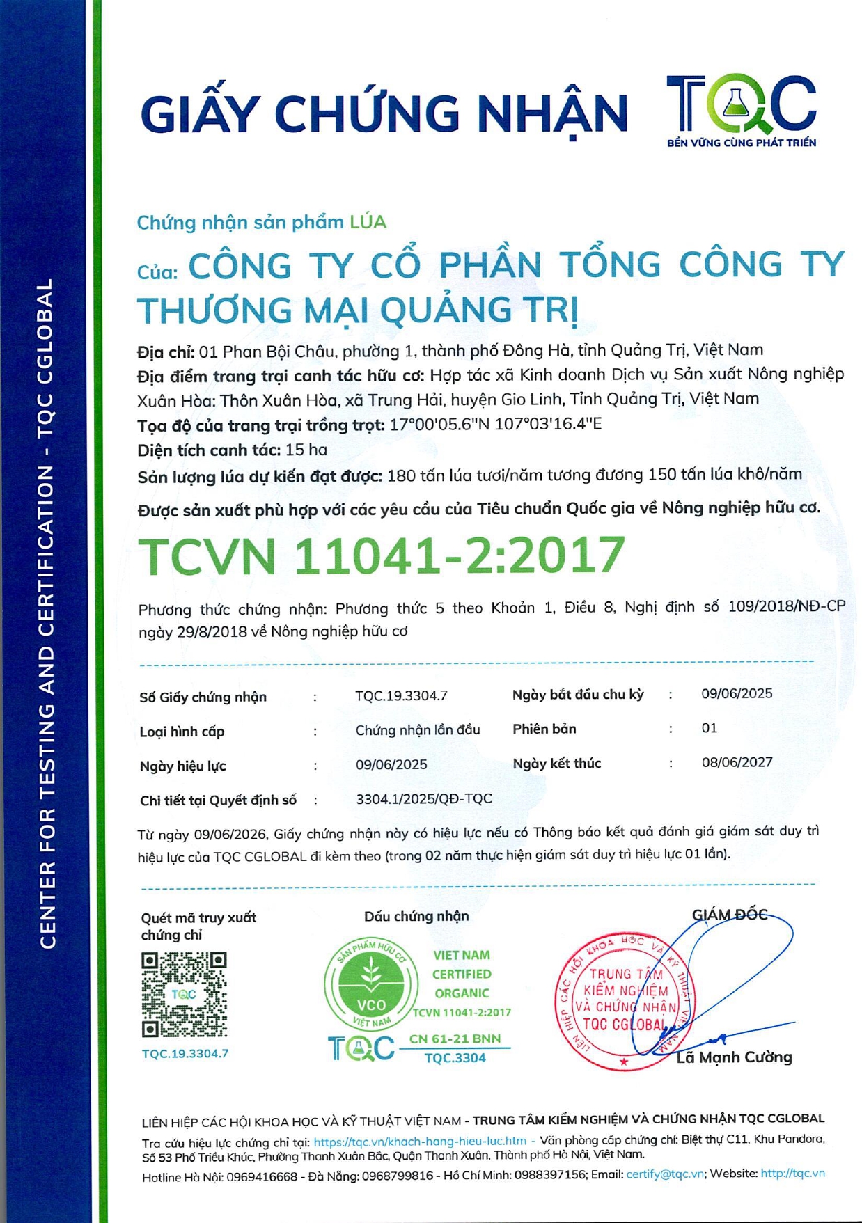 - Đạt giấy chứng nhận hữu cơ của TQC theo tiêu chuẩn TCVN 11041-5:2018 (Xin vui lòng xem file đính kèm)