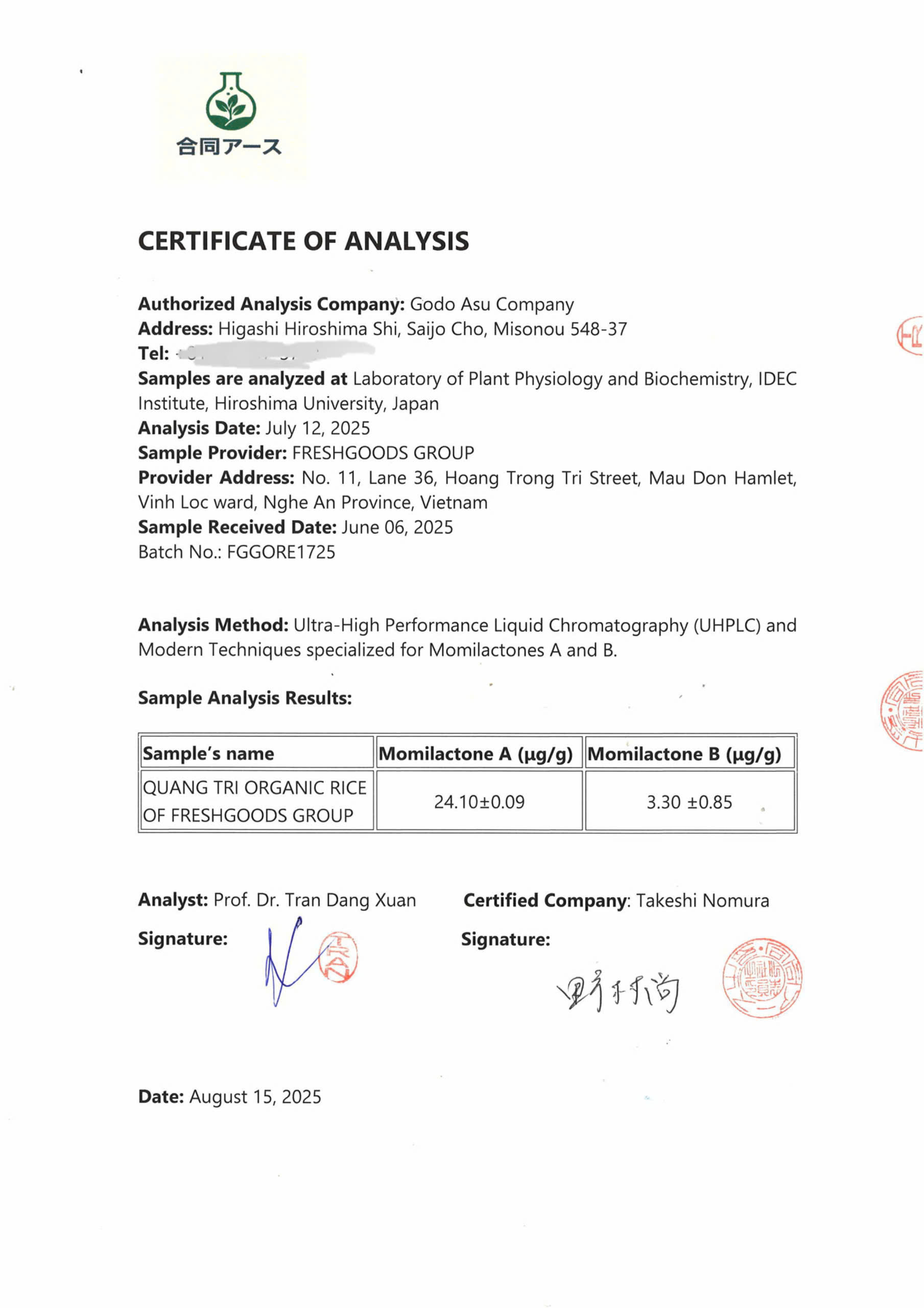 1. Gạo hữu cơ Quảng Trị của Freshgoods Group đặc biệt chứa hàm lượng cao hợp chất Momilactones A (MA) và Momilactones B (MB) (Xin vui lòng xem kết quả phân tích đính kèm). Theo