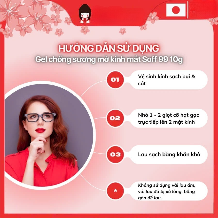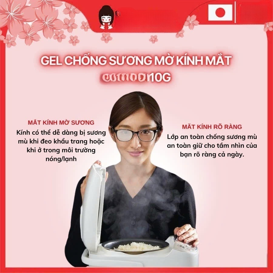 Gel chống sương mù dành cho kính có thể làm tan sương mù khi đeo mắt kính. Có thể sử dụng kính ngay sau khi bôi gel mà không cần phải chờ khô.