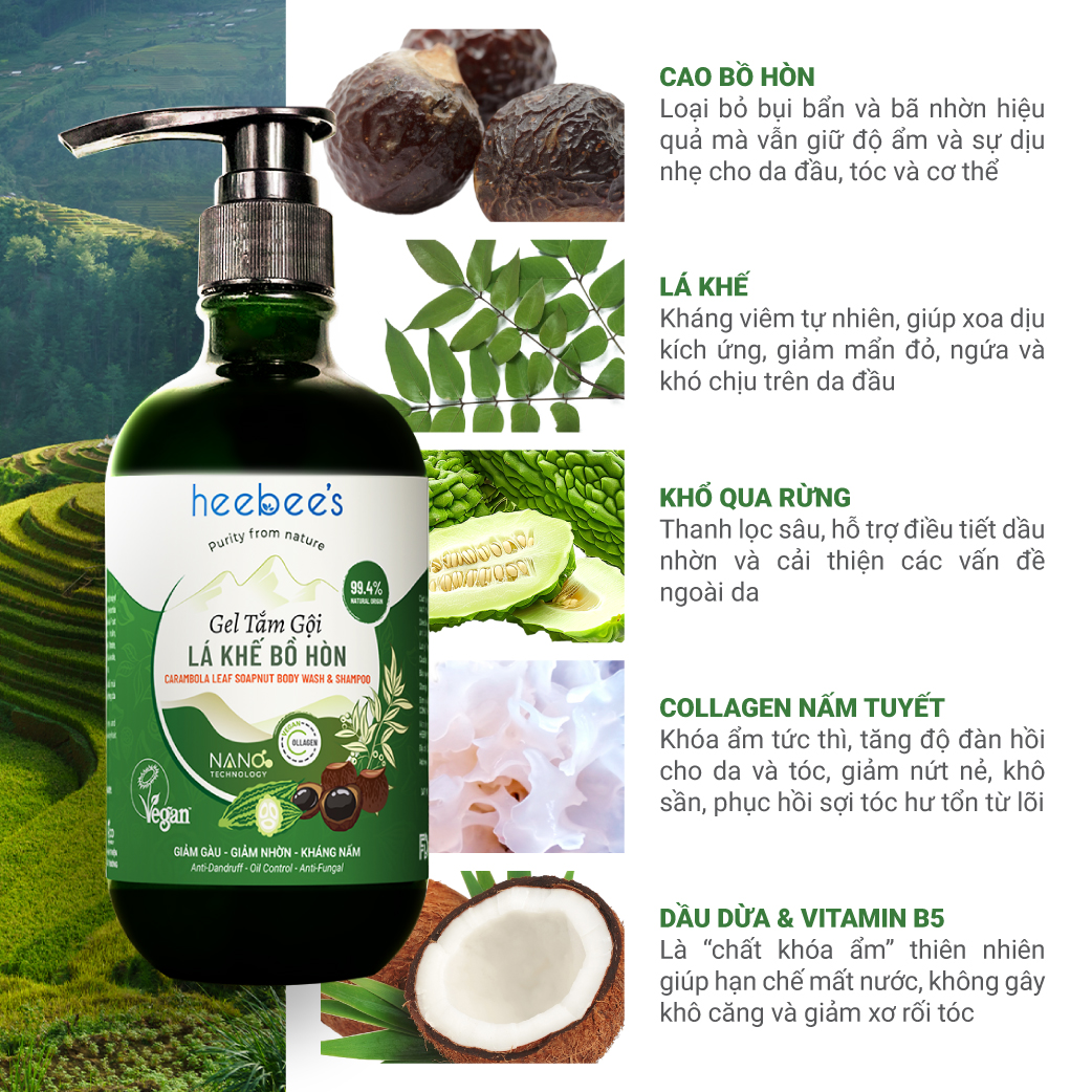 ✨Gel Tắm Gội Lá Khế Bồ Hòn Heebee's Giảm Gàu, Giảm Nhờn, Kháng Nấm 300ml - 500ml