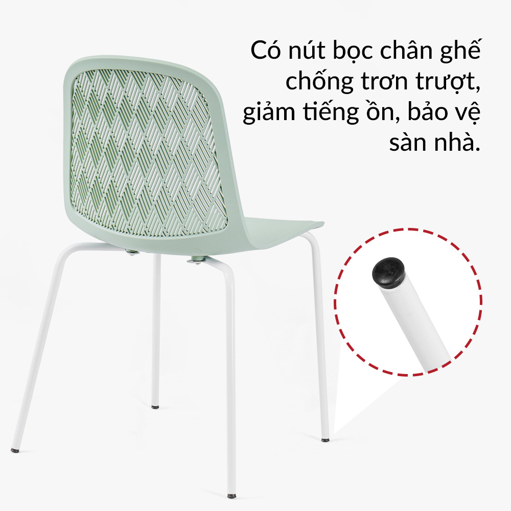 Ghế với chất liệu nhựa PP có đặc tính mềm dẻo, đàn hồi cao, ít bị biến dạng do tác động lực và an toàn cho sức khỏe người dùng. Bề mặt hoàn thiện sắc sảo kết hợp lưng tựa hoa văn dạng lưới thoáng khí, có độ lồi lõm nhẹ, vuốt cong ôm lấy lưng người ngồi. Chân ghế làm bằng chất liệu kim loại sơn tĩnh điện chắc chắn, mang tới vẻ đẹp sang trọng và thanh thoát cho sản phẩm Dưới chân đế có nút nhựa dẻo chống trơn trượt, giảm ồn và không gây trầy xước sàn nhà.