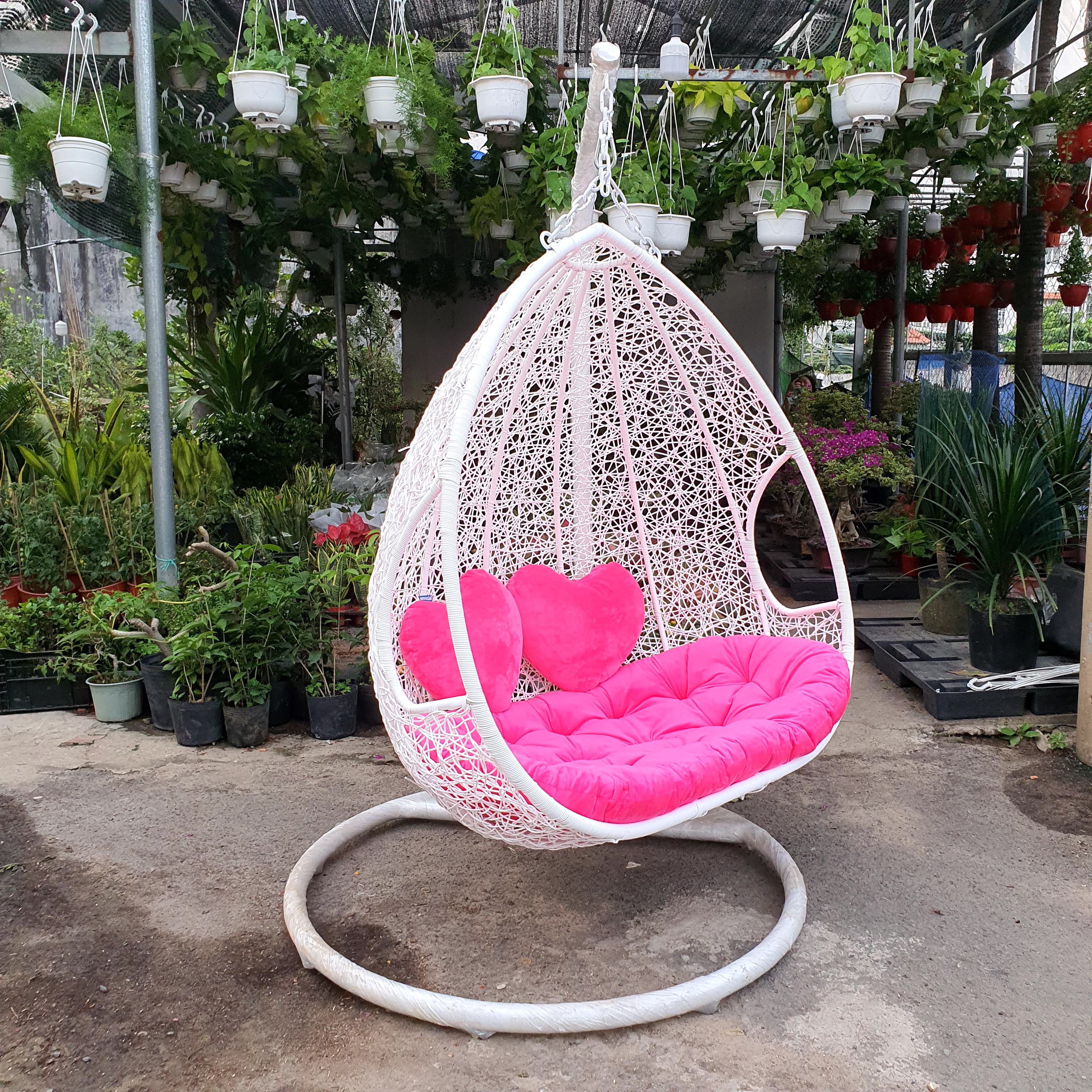 Bộ sản phẩm gồm : + Bộ nệm và 02 gối hình trái tim màu hồng + Thân lồng xích đu được sơn tĩnh điện và được đan nhựa giả mây màu hồng như hình