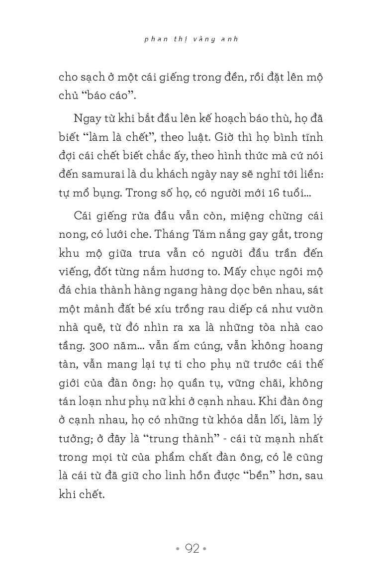 …Khi đã lùi xa khỏi sự kiện, tản văn của Phan Thị Vàng Anh là những bài học về phép ứng xử với cuộc sống, với chữ nghĩa, những thứ xem ra giới viết đã bàn nát nước nhưng làm được như thế lại là một chuyện khác, đòi hỏi không được buông tha sự quyết liệt của chính mình. Sự quyết liệt mà đa số chúng ta, sểnh ra là xẹp.”