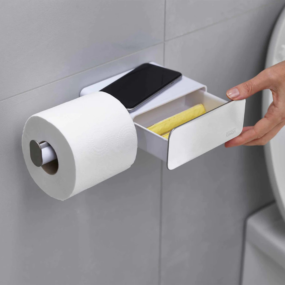 Cũng như giữ cuộn giấy vệ sinh, giá đựng cuộn thông minh treo tường này có một số tính năng bổ sung. Nó có một kệ lưu trữ tiện dụng để đặt các vật dụng nhỏ như điện thoại di động, sách hoặc đồ dùng vệ sinh cá nhân nhỏ. Nó cũng bao gồm một ngăn kéo nhỏ hoàn hảo để cất giữ riêng các vật dụng vệ sinh. Cuối cùng, nó có ngăn đựng cuộn giấy vệ sinh có độ bám ma sát giúp cuộn giấy vệ sinh không bị bung ra quá nhanh và viền bằng thép không gỉ với lớp phủ chống dấu vân tay. Nó dễ dàng gắn vào tường và đi kèm với giá đỡ và vít riêng. Hướng dẫn lắp đặt, ốc vít và các bản sửa lỗi đi kèm. Kích thước: 2½ x 11¼ x 4½ inch (6 x 28,5 x 11 cm). Tải trọng kệ tối đa 2,2 lb (1 kg). Lau bằng khăn ẩm để làm sạch.