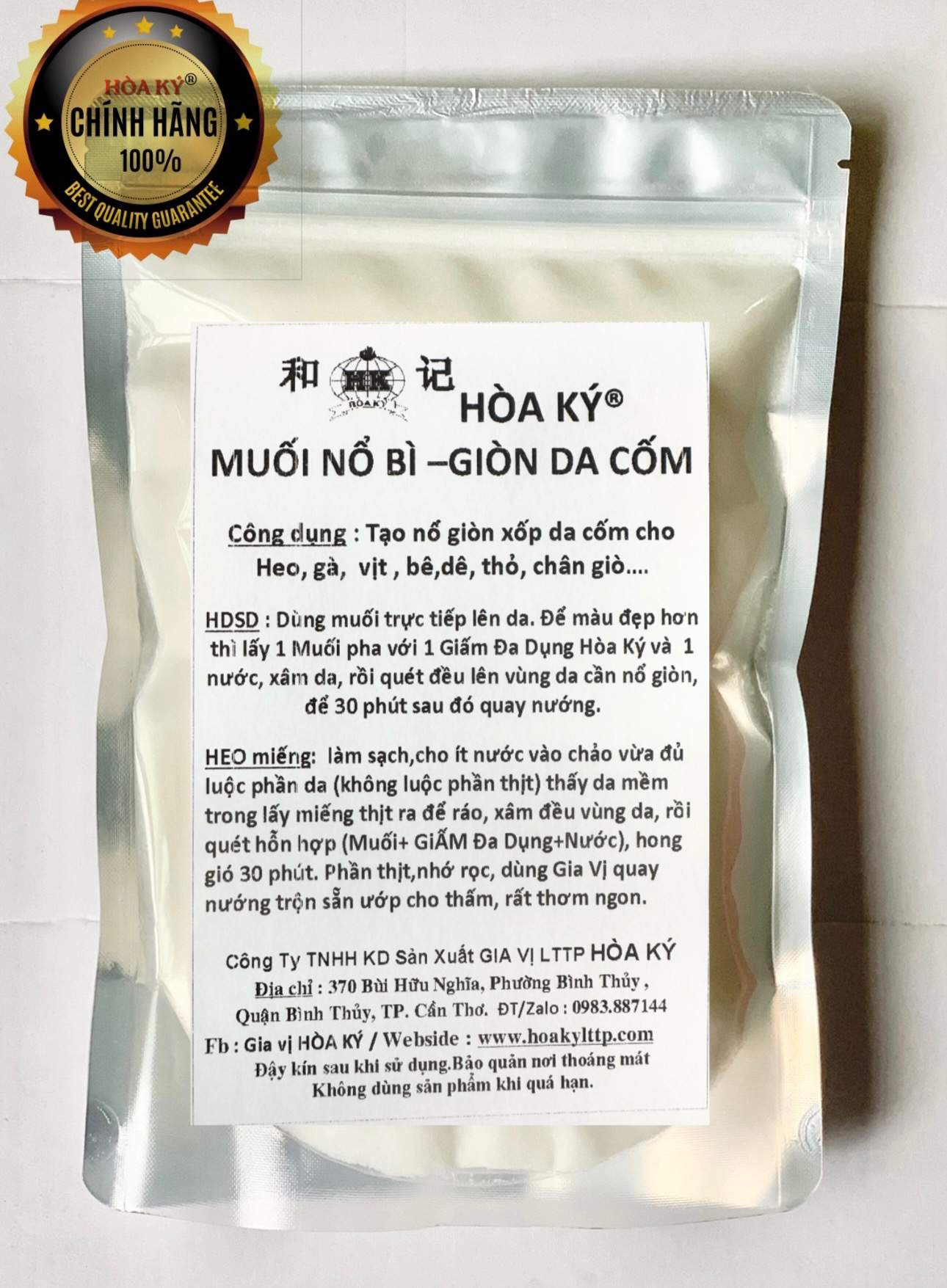 Combo quay nướng đầy đủ gia vị, không cần nêm thêm. Gồm có : Muối nổ bì giòn da cốm Gia vị trộn sẵn ướp phần thịt Giấm (Dấm) đa dụng tạo màu đẹp ,da giòn . Thực phẩm : cho Heo, gà,  vịt , bê,dê, thỏ, chân giò, chim bồ câu ….tạo nổ giòn xốp da cốm, thịt thấm vừa ăn thơm ngon. HDSD : Dùng muối trực tiếp lên da. Để màu đẹp hơn thì lấy 1 Muối pha với 1 Giấm Đa Dụng Hòa Ký và  1 nước, rồi quét đều lên vùng da cần nổ giòn, để 30 phút sau đó quay nướng. HEO miếng:  làm sạch,cho ít nước vào chảo vừa đủ luộc phần da (không luộc phần thịt) thấy da mềm trong lấy miếng thịt ra để ráo, xâm đều vùng da, rồi quét hỗn hợp (Muối+ GiẤM Đa Dụng+Nước), hong gió 30 phút. Phần thịt,nhớ rọc, dùng Gia Vị quay nướng trộn sẵn ướp cho thấm, rất thơm ngon. Dùng gia vị ít hay nhiều đều được ( tuỳ khẩu vị) . Dùng được cho món Chay.
