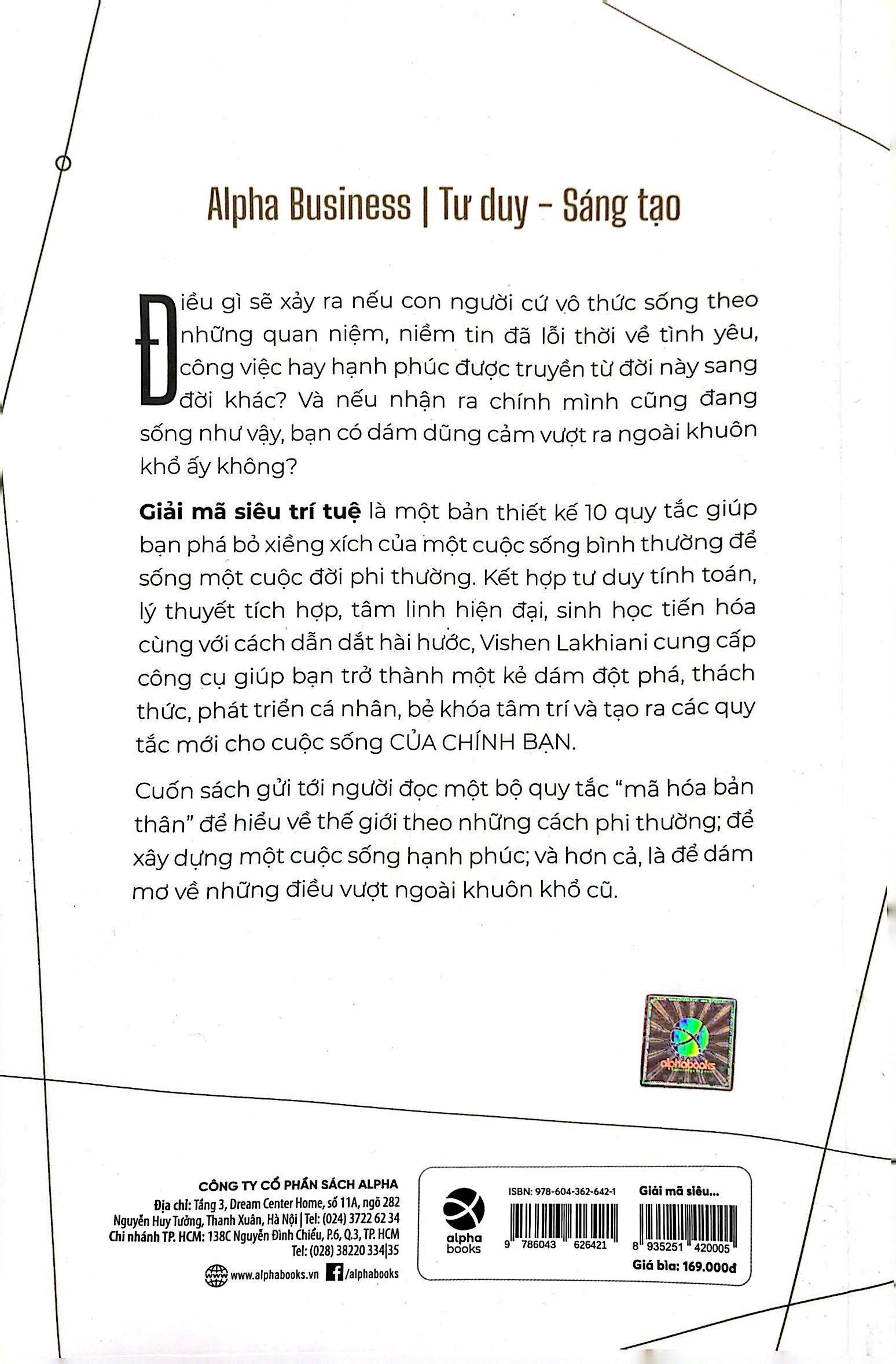 Giải mã siêu trí tuệ là một bản thiết kế 10 quy tắc giúp bạn phá bỏ xiềng xích của một cuộc sống bình thường để sống một cuộc đời phi thường. Kết hợp tư duy tính toán, lý thuyết tích hợp, tâm linh hiện đại, sinh học tiến hóa cùng với cách dẫn dắt hài hước, Vishen Lakhiani cung cấp công cụ giúp bạn trở thành một kẻ dám đột phá, thách thức, phát triển cá nhân, bẻ khóa tâm trí và tạo ra các quy tắc mới cho cuộc sống CỦA CHÍNH BẠN.