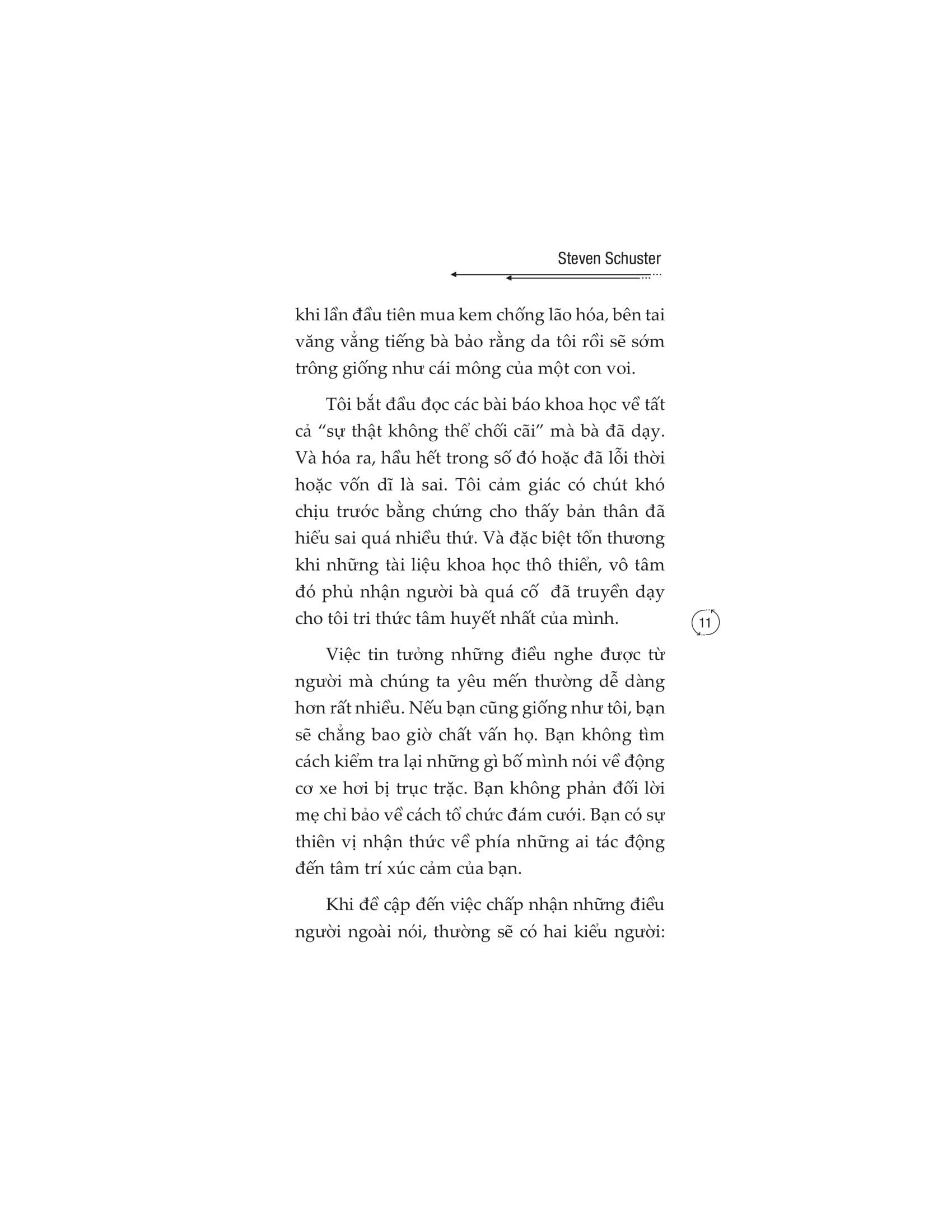 “Bản chất con người vốn hay suy nghĩ. Chính khả năng suy nghĩ đó khiến chúng ta khác biệt với các giống loài khác. Chúng ta nhận thức được việc mình suy nghĩ. Thói quen nhận thức ngày càng phát triển hơn khi chúng ta lớn lên. Chúng ta học hỏi từ cha mẹ. Sau đó đi học, lên đại học, tìm được công ăn việc làm, đọc thật nhiều sách, xem cả tá phim ảnh và kết nối với mọi người. Mỗi một hoạt động này đều vô tình ảnh hưởng đến cách suy nghĩ của chúng ta. Kinh nghiệm nhận thức định hình thế giới quan của mỗi người. Mọi thứ mà cá nhân chúng ta trải nghiệm sẽ đi qua bộ lọc của bản thân và được hợp thức hóa. Rất thực tế. Còn thực tế hơn cả những thứ chúng ta chưa từng trải qua. Cho dù những điều chúng ta tin có thể không phải lúc nào cũng đúng.”