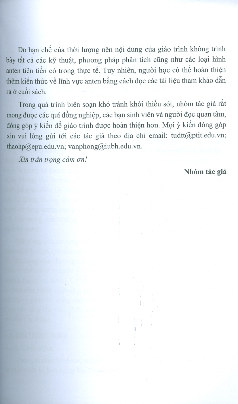 Nội dung của giáo trình giới thiệu một cách tổng quát các nguyên tắc cơ bản của anten đến các hệ thống anten thông minh, tiên tiến. Giáo trình trình bày bắt đầu từ lý thuyết đến nguyên lý cũng như các nguyên tắc áp dụng cho thiết kế anten trong các hệ thống truyền thông vô tuyến hiện nay. Nội dung lý thuyết trong mỗi chương đều bao gồm các công thức toán học với phân tích chi tiết, minh họa cụ thể để các sinh viên chuyên ngành Điện tử - Viễn thông với mức học trung bình trở lên có thể đọc hiểu, nắm bắt được kiến thức và không quá khó khăn trong việc phân tích cũng như thiết kế các loại hình anten cơ bản. Bên cạnh đó, với kinh nghiệm là sinh viên, kỹ sư, giảng viên, nhóm tác giả mong muốn tiên phong trong việc cập nhật những tiến bộ trong công nghệ anten tiên tiến, giúp sinh viên có thể làm chủ được công nghệ mới, nhanh chóng bắt kịp được công việc sau khi tốt nghiệp.