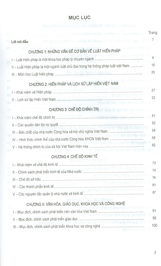 Chương 1: Những vấn đề cơ bản về luật hiến pháp. Chương 2: Hiến pháp và lịch sử lập hiến Việt Nam. Chương 3: Chế độ chính trị. Chương 4: Chế độ kinh tế. Chương