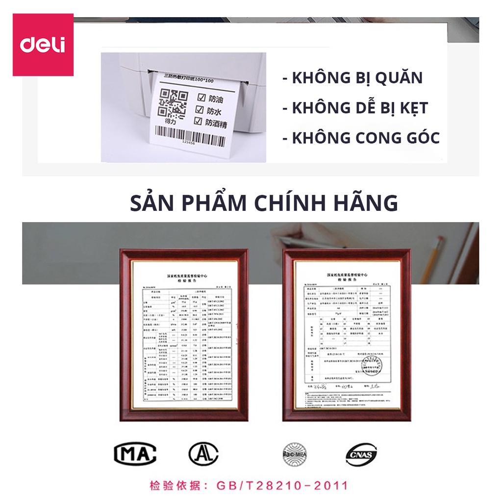THÔNG TIN SẢN PHẨM:- Tên sản phẩm: Giấy decal in nhiệt Deli- Mã sản phẩm: 12308- Kích thước: 100*150mm 325 tờ TÍNH NĂNG SẢN PHẨM: - Màu: trắng - chữ đen- Dạng cuộn: 325 tờ/ cuộn- Giấy in nhiệt nhanh - tiết kiệm- Bóc ra dính ngay, không cần băng dính- Không cần mực in- Không phai mực (trong điều kiện thường)- Thích nghi nhiều môi trường (lạnh, mưa, nóng, hút chân không)- Khổ giấy phù hợp đơn hàng TMĐT, mã vạch, thẻ tag, in giá sản phẩm- Giấy decal dính được- Đa năng - dễ sử dụng - an toàn ------------------------------------------------------------------------------------------------------------------------------------------------------------------------------------Deli Offical Store - Cửa hàng độc quyền sản phẩm duy nhất tại Việt NamNgoài cung cấp các sản phẩm văn phòng phẩm, Deli còn cung cấp các sản phẩm thiết bị, máy móc hỗ trợ cho việc tối ưu hóa hiệu quả làm việc cho doanh nghiệp. Với phương châm luôn luôn thấu hiểu khách hàng và cung cấp các giải pháp hoàn thiện hóa và trải nghiệm mới thông qua sự đổi mới không ngừng, do đó giúp khách hàng doanh nghiệp của Deli gia tăng năng suất và hiệu quả chính xác hơn. Khách hàng lựa chọn các sản phẩm của Deli Office Accessories sẽ được cam kết: Sản phẩm chính hãng từ nhà máy Deli, nguồn gốc rõ ràng và chất lượng đạt tiêu chuẩn. Các sản phẩm được nghiên cứu, trải qua quá trình thử nghiệm nghiêm ngặt tại nhà máy Deli.Bảo hành theo quy định của nhà sản xuất. Giá cả hợp lý, cạnh tranh, rẻ nhất thị trường.Hỗ trợ đổi trả hàng cho những sản phẩm bị thiếu .