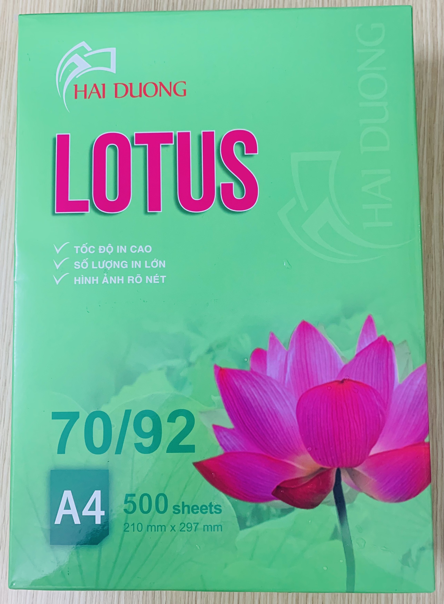 Giấy A4 Lotus hải Dương định lượng 70gsm Mô tả sản phẩm: – Xuất xứ : Việt Nam – Định lượng: 70 g/m2 – Độ trắng: 92 % – Kích thước: A4 (210x297mm) – Quy
