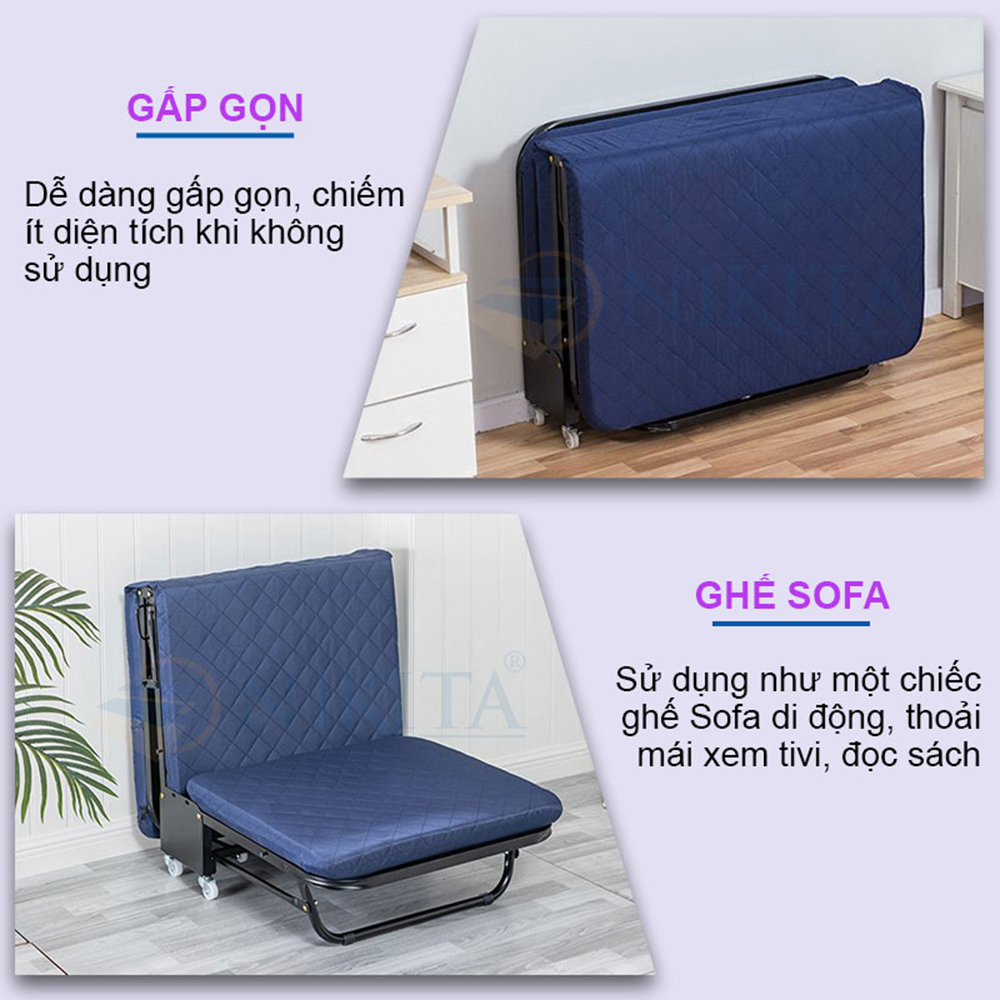 - Giường gấp nikita: có thể làm giường dự phòng trong nhà chờ khi có khách thì mang ra sử dụng, nhờ đặc tính gấp gọn tiện dụng dễ dàng cất giữ, kèm Drap chống bụi, không sợ giường bị bám bụi khi cất giữ lâu.
