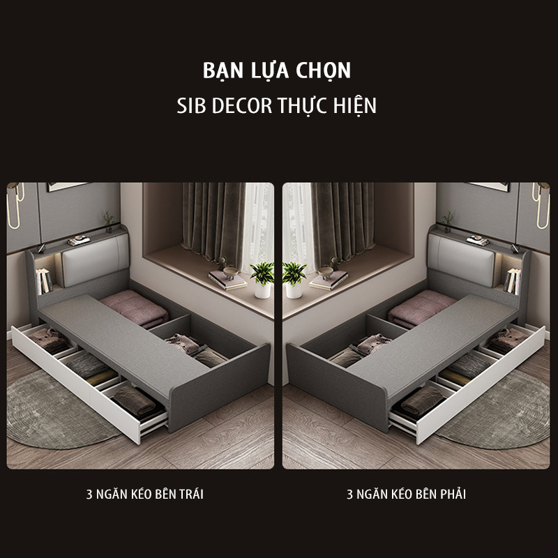 ✨Giường Gỗ Đơn Dài 1.2m Phối Đèn LED và 3 Ngăn Kéo Màu Vân Vải Phối Trắng SIB Decor GN15