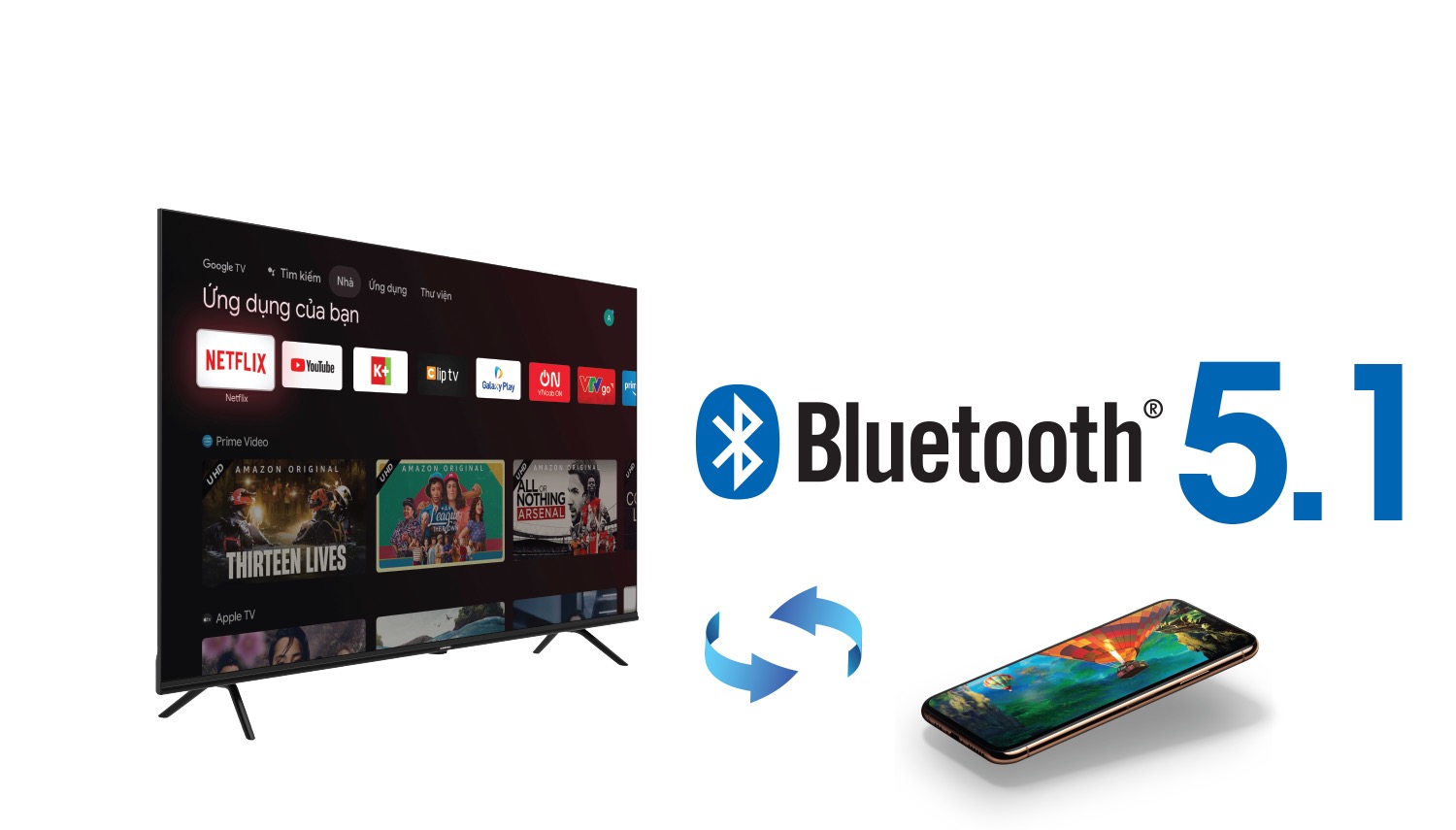 TV được tích hợp Bluetooth 5.1, có thể phát âm thanh từ TV ra loa hoặc biến chiếc TV của bạn thành chiếc loa để phát nhạc từ Smartphone hoặc máy tính, ngay cả khi đã tắt màn hình TV.