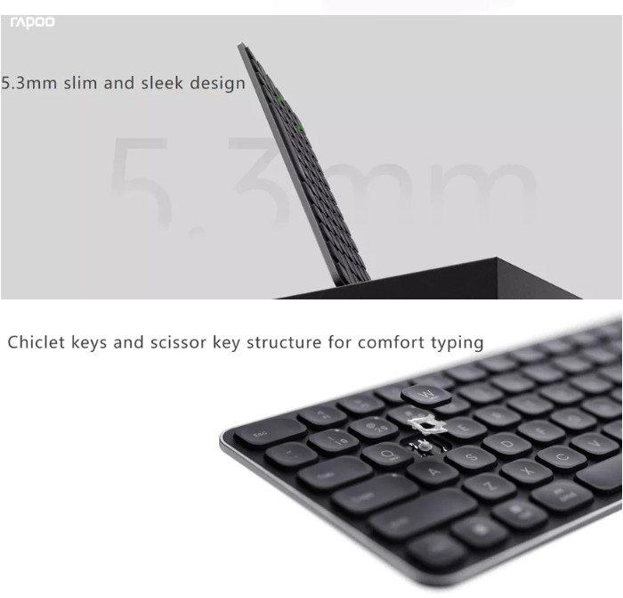 Mua tại Tiktok[ Chính Hãng ] Bàn phím không dây Rapoo E9050L - Bluetooth & WIFI 2.4G - dùng cho Windows & Mac - BH 24 tháng Bố cục nhỏ gọn 78 phím Thiết kế mỏng và đẹp mắt 5,3mm Khung và đế sau bằng hợp kim nhôm Chuyển đổi giữa Bluetooth 4.0, 5.0 và 2.4G Chuyển đổi một cú nhấp chuột giữa nhiều thiết bị Cấu trúc phím chiclet và phím cắt kéo giúp gõ phím thoải mái Phím tắt đa phương tiện FN Pin sạc 500mAh thân thiện với môi trường Thời lượng pin lên đến 240 giờ khi sạc đầy Tương thích với Windows và Mac Kích thước (dài x rộng x cao) : 28411913mm