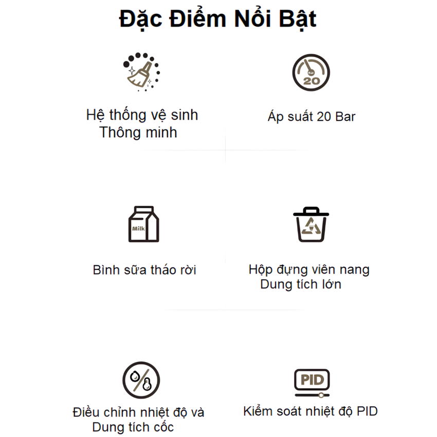 Bơm Italy áp suất 20 bar tạo ra tách cà phê đậm đà Công suất 1400W, điện áp 220-240V/50Hz-60Hz Gia nhiệt nhanh chóng, đảm bảo cà phê chiết xuất với nhiệt độ lý tưởng nhất