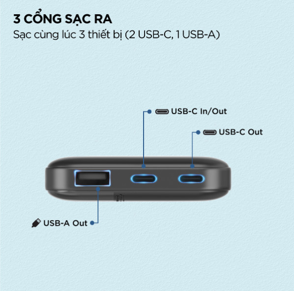 Tính năng Dung lượng 10.000mAh tương ứng 37Wh cung cấp đến nhiều giờ sử dụng cho các thiết bị điện tử 3 cổng sạc ra gồm 1 USB-A và 2 USB-C, thoải mái sạc 3