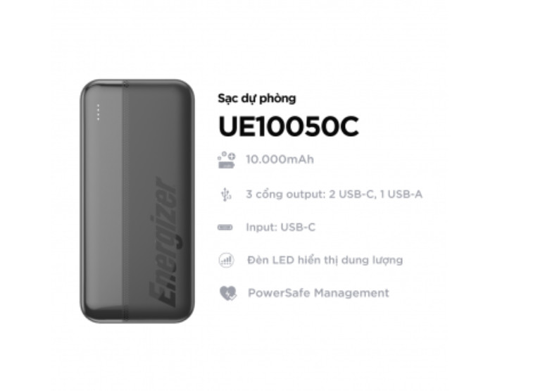 Sạc dự phòng Energizer 10.000mAh Li-Polymer - UE10050CC Mỏng nhẹ - Sạc đa cổng Thêm thành viên mới, Energizer tiếp tục trình làng trong bộ sưu tập pin dự phòng 10.000mAh. Pin UE10050CC với thiết