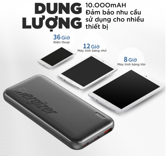 Dung lượng 10.000mAh tương ứng 37Wh cung cấp đến nhiều giờ sử dụng cho các thiết bị điện tử