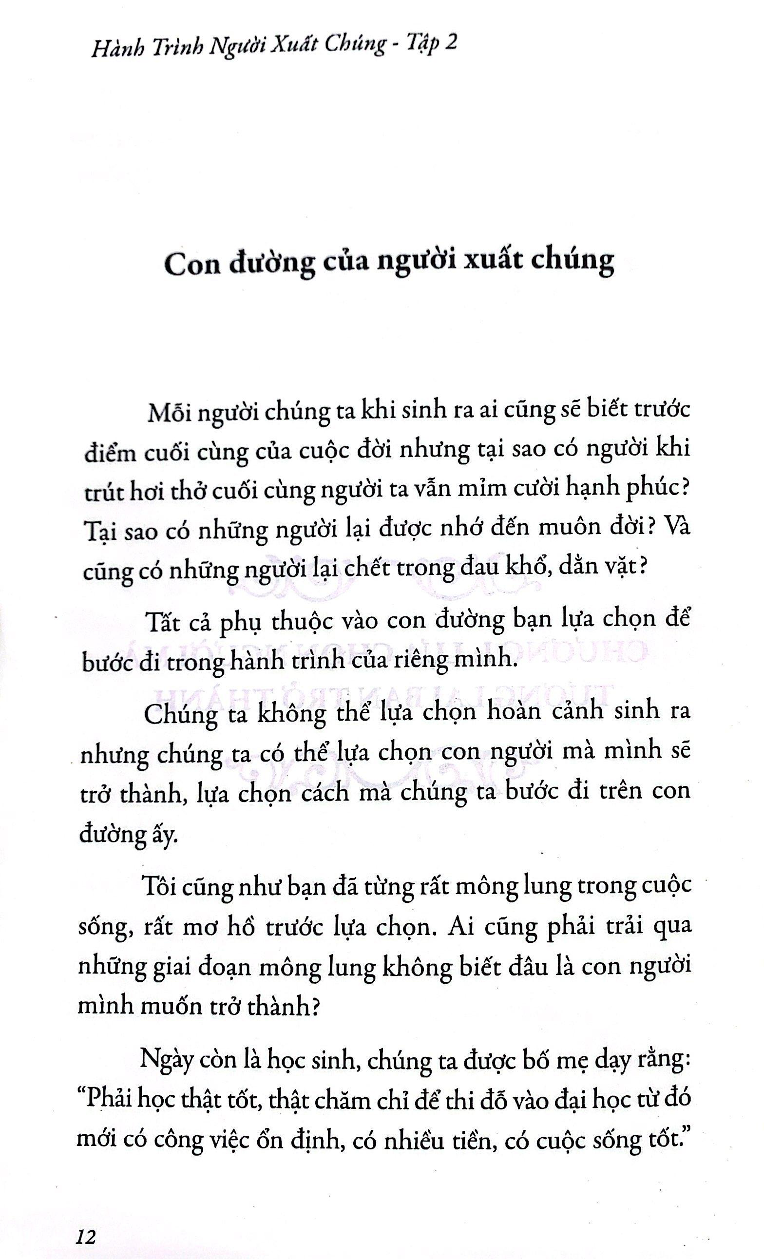 Không bao giờ bỏ cuộc, không bao giờ ngừng tin tưởng chính m.ình. Hãy tạo ra kỷ luật, động lực và năng lượng tích cực cho mỗi phút giây bạn sống trên đời. Bạn sẽ nhận ra không chỉ bạn, mà cả những người đồng hành với bạn cũng sẽ có những thay đổi vượt bậc. Hãy đặt ra những nguyên tắc để thành công, vẽ cho m.ình những mục tiêu lớn, liên tục cho đi để có thể nhận về những điều tốt đẹp. Hãy mơ và hãy hành động để biến ước mơ thành hiện thực. Xuất chúng từ tư tưởng đến con người. Đó là hành trình bạn phải đi.