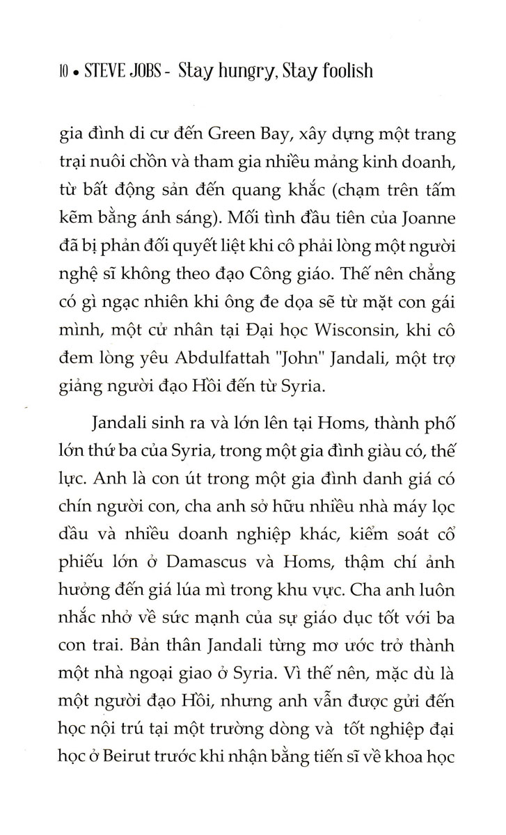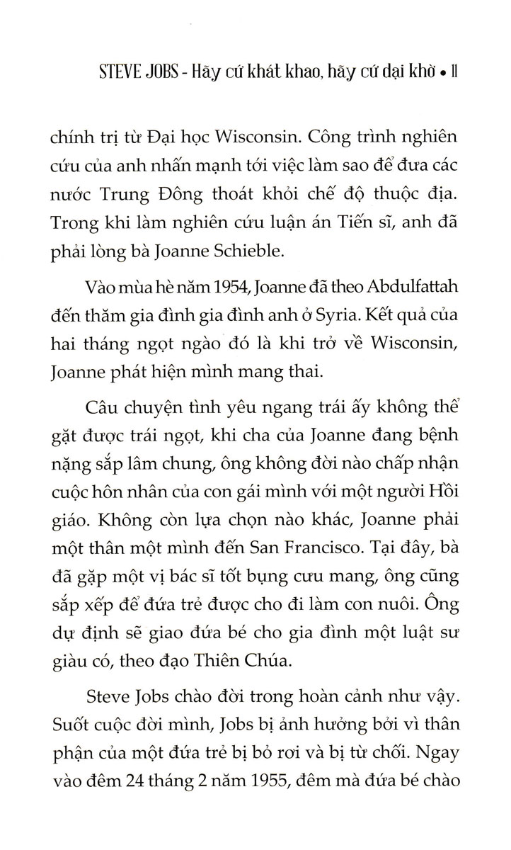 Mua tại TiktokHãy Cứ Khát Khao Hãy Cứ Dại Khờ (Sbooks) STAY HUNGRY, STAY FOOLISH - THẾ GIỚI NÀY KHÔNG VÌ BẠN LÙI BƯỚC MÀ SẼ TRỞ NÊN DỊU DÀNG VỚI BẠN HƠN, HAY CUỘC ĐỜI BẠN SẼ TRỞ NÊN TỐT ĐẸP HƠN. THẾ NÊN, HÃY CỨ KHÁT KHAO ĐI, KHÁT KHAO BẰNG TẤT CẢ NHỮNG GÌ BẠN CÓ. HÃY CỨ DẠI KHỜ ĐI, HÃY DẠI KHỜ TIN RẰNG KHÁT KHAO CỦA MÌNH NHẤT ĐỊNH SẼ TRỞ THÀNH HIỆN THỰC. Đây chắc chắn là nguồn cảm hứng tuyệt vời nhất bạn tìm thấy được từ cuộc đời của một thiên tài công nghệ Steve Jobs. Bên cạnh những nỗ lực ấn tượng liên quan đến sự ra đời của Apple, chắc chắn rất ít người biết Steve Jobs đã từng thực hiện một chiến dịch thương hiệu - một chiến dịch thể hiện rõ ràng tư duy, quan điểm, và thái độ của những người gia nhập vào ngành công nghệ. Steve Jobs từng nói: “Đó không phải vấn đề tốc độ xử lý hay bộ nhớ, nó nói về sự sáng tạo. Ở Apple chúng tôi đã quên mất mình là ai. Có một cách để nhớ bạn là ai, đó là nhớ ai là người hùng của bạn. Đây là cốt lõi của chiến dịch này”. Chiến dịch này không chỉ nhắm tới các khách hàng tiềm năng mà còn hướng tới các nhân viên của Apple. Họ đã dùng cụm từ “Tư duy khác biệt” và cũng như những người điên, “bởi chỉ những người đủ điên khùng để nghĩ họ có thể thay đổi thế giới chính là những người thay đổi thế giới”. Jobs phát biểu: Apple hướng tới những người có tư duy vượt khỏi khuôn khổ, những người muốn dùng máy tính để giúp họ thay đổi thế giới. Ngoài quảng cáo thương mại trên truyền hình, họ đã thực hiện một trong những chiến dịch quảng cáo in đáng nhớ nhất trong lịch sử. Họ cho in các tờ quảng cáo có hình các nhân vật lịch sử dễ nhận diện như Einstein, Lennon, Dylan, Picasso, Edison, Chaplin, King… với biểu tượng của Apple và dòng chữ “Tư duy khác biệt” ở góc. Điều gây tò mò ở quảng cáo này là họ in cả chân dung của những người không dễ nhận ra khiến người ta phải dừng lại và bàn tán nhau. Những người này thường có điểm chung là những người sáng tạo và chấp nhận rủi ro, không ngại thất bại và đánh cược cả sự nghiệp của mình để làm việc theo những cách khác biệt. Ý tưởng của việc quảng cáo này là động viên mọi người khẳng định chính họ như những cá thể độc lập, sáng tạo, đổi mới một cách táo bạo chỉ đơn giản bằng chiếc máy tính mà họ dùng. HÃY CỨ KHÁT KHAO, HÃY CỨ DẠI KHỜ chính là bức tranh toàn diện về cuộc đời cảm hứng của “Cha đẻ” Apple - Steve Jobs. Ở đây, bạn có thể tìm thấy những thông tin, những tuyên ngôn thuộc về Steve Jobs mà trước đây chưa ai đề cập với bạn.