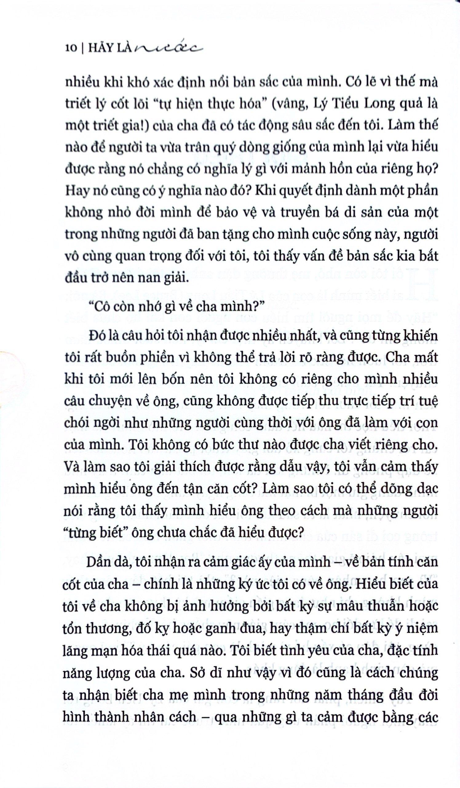 Bản chất của nước là sự chảy. Nước luôn tìm ra cách đi vòng quanh (hoặc thậm chí xuyên qua) các chướng ngại vật. Đặc điểm ấy, cha tôi gọi là “vô hạn”. Nước hiện diện trọn vẹn trước mọi cảnh huống và môi trường xung quanh nên sẵn sàng chuyển dịch theo bất kỳ hướng nào mà nó có thể chảy qua. Sự cởi mở và dễ nắn uốn ấy cho thấy nước luôn ở trạng thái sẵn sàng, nhưng đây là một sự sẵn sàng tự nhiên vì nước chỉ đơn giản đang trọn vẹn là chính nó. Vậy, sống giống như nước tức là nhận biết con người hoàn chỉnh nhất, tự nhiên nhất và được hiện thực hóa cao nhất trong bạn – tức là con người đang sống hết m.ình nhất để tiến bước trên con đường riêng trong dòng chảy của cuộc sống.
