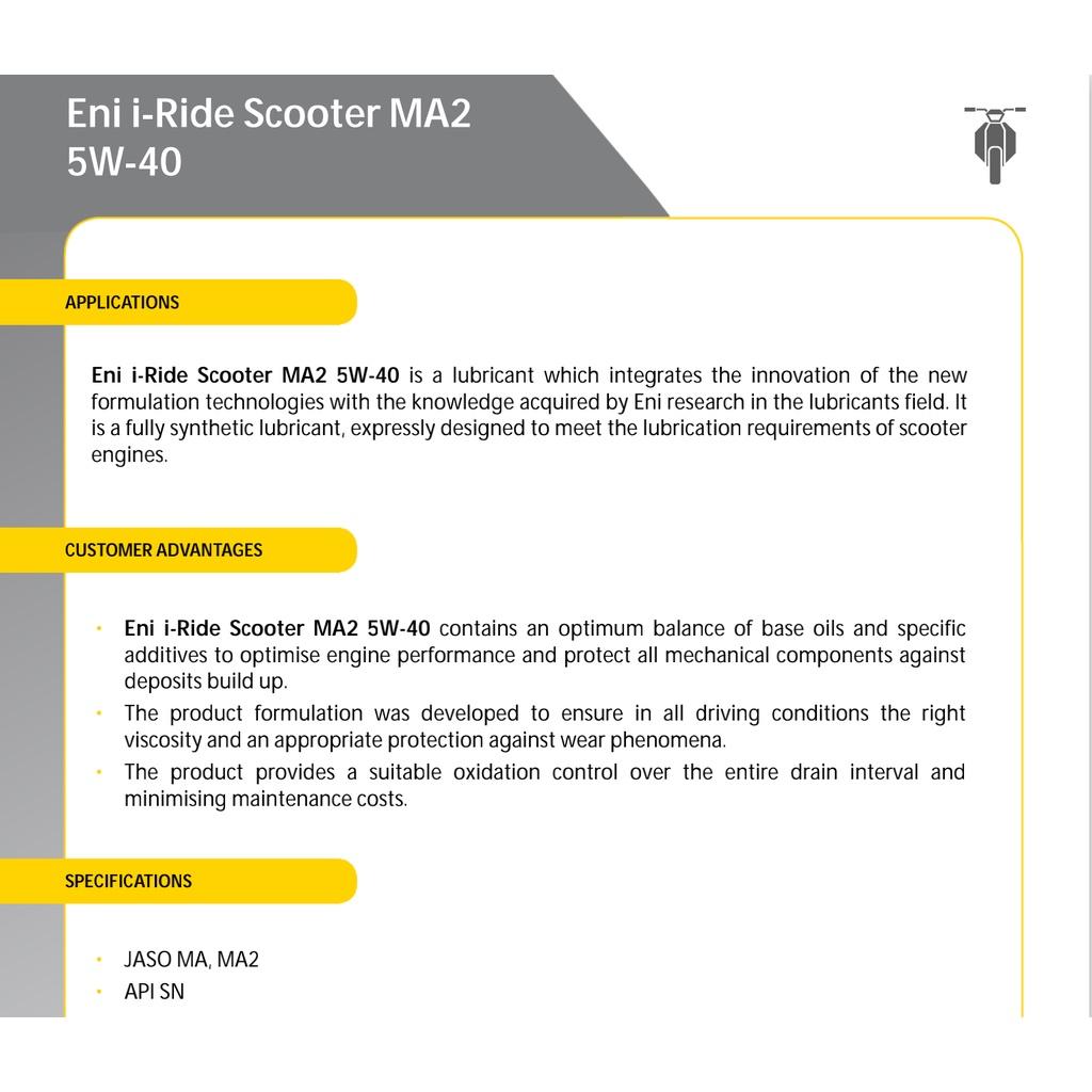 ENI I-RIDE SCOOTER MA2 5W-40 là dầu nhớt bôi trơn tích hợp sự đổi mới trong công nghệ pha chế từ nghiên cứu của các chuyên gia Eni trong lĩnh vực dầu nhờn). Tính chất . Cấp nhớt: JASO MA, MA2 | API SN . Phân loại: Nhớt tổng hợp toàn phần (Fully Synthetic) Đặc tính . Khả năng bôi trơn vượt trội, chống mài mòn hiệu quả. . Khả năng làm sạch động cơ, không để lại cặn bẩn trong khoang máy. . Khả năng chịu được nhiệt độ cao mà không làm giảm công suất. . Khả năng tăng tốc cực nhạy, đáp ứng mọi tình huống. . Chống oxy hóa cao, đảm bảo tuổi thọ của động cơ. . Tiết kiệm nhiên liệu và bảo vệ môi trường. Ứng dụng . Sử dụng được cho hầu hết các loại xe: xe ga và xe số động cơ 4 thì. . Khuyến khích cho các dòng xe có hiệu suất cao. . Được đề xuất sử dụng cho hãng xe Vespa của Piaggio.