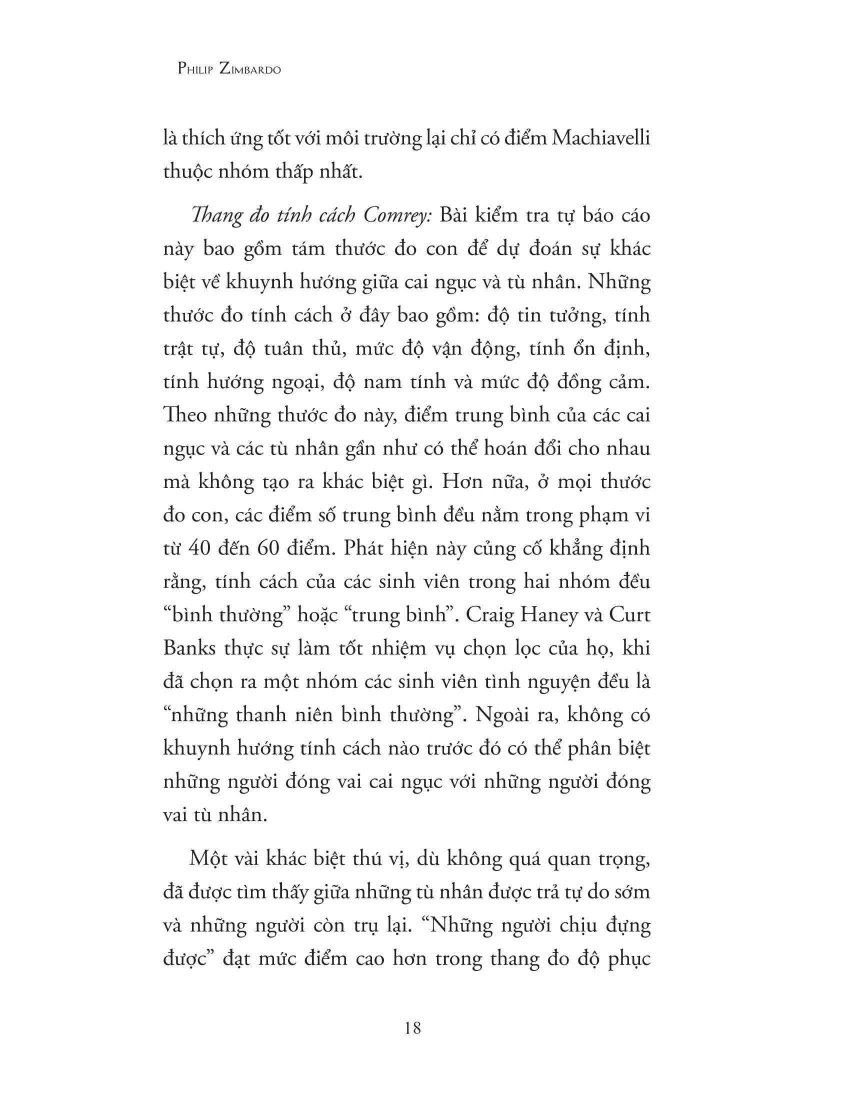 Phần tiếp theo của tập 2 viết về thí nghiệm nhà tù Stanford sẽ kể lại chi tiết tình huống nghiên cứu về sự biến đổi của các sinh viên đại học khi họ được phân công ngẫu nhiên đóng vai tù nhân hoặc cai ngục trong một nhà tù giả. Một trong những kết luận chính từ thí nghiệm nhà tù Stanford là sức mạnh của một loạt biến số hoàn cảnh, dù không biểu hiện rõ ràng nhưng lại có thể chi phối ý chí phản kháng của một cá nhân. Kết luận đó càng được khẳng định hơn trong các chương sách trình bày về hiện tượng này trong các nghiên cứu khoa học xã hội khác. Những người tham gia nghiên cứu - các sinh viên đại học và cả những công dân bình thường - đã thích ứng, tuân thủ, phục tùng và dễ dàng bị dụ dỗ thực hiện những việc mà họ không thể tưởng tượng được là mình sẽ làm khi ở ngoài hoàn cảnh đó. Chúng ta cũng sẽ vượt ra ngoài môi trường thí nghiệm để tìm hiểu về hiệu ứng Lucifer trong thực tế, đặc biệt là câu chuyện về những vụ ngược đãi và tra tấn khủng khiếp các tù nhân tại nhà ngục Abu Ghraib, Iraq. Chúng ta sẽ đào sâu vào địa điểm, con người và hoàn cảnh để đưa ra kết luận về các nguyên nhân dẫn đến những hành vi tàn bạo xuất hiện trong “bộ ảnh chiến tích” mà những người lính đã ghi lại trong quá trình hành hạ tù nhân. Hành trình khắc nghiệt đào sâu đến tận cùng bóng tối sẽ kết thúc trong chương cuối cùng. Khi đó, ta tìm hiểu một số thông tin tích cực về bản chất con người, về những gì mà mỗi cá nhân chúng ta có thể làm để đương đầu với sức mạnh của hoàn cảnh và hệ thống. Trong tất cả những nghiên cứu và các ví dụ thực tế, luôn có một số cá nhân phản kháng và không chịu khuất phục trước cám dỗ. Thứ giúp họ thoát khỏi cái ác không phải là bản tính thiện lành bẩm sinh, mà thường là do sự hiểu biết của họ (dẫu còn khá bản năng) về các chiến thuật phản kháng về mặt tinh thần và xã hội. Cuốn sách cung cấp một số chiến thuật có thể giúp mọi người chống lại những ảnh hưởng xã hội không mong muốn - những giải pháp này dựa trên sự kết hợp giữa kinh nghiệm của tác giả cùng các cộng sự trong chuyên ngành tâm lý xã hội, hay những chuyên gia về ảnh hưởng và thuyết phục. Khi hầu hết mọi người đều chịu khuất phục và chỉ một số ít dám đứng lên, những người bất tuân có thể được coi là anh hùng. Hành trình của cuốn sách này sẽ kết thúc bằng sự tích cực khi tôn vinh bản chất anh hùng tồn tại trong mỗi chúng ta. Trái ngược với “sự tầm thường của cái ác”, lý thuyết cho rằng những người bình thường đều có thể suy đồi và trở nên tàn ác, tác giả Zimbardo đặt ra thuật ngữ “sự tầm thường của chủ nghĩa anh hùng” để tôn vinh mọi người đàn ông và phụ nữ đã tuân theo lời thúc giục đấu tranh vì nhân loại khi đến thời điểm buộc phải hành động. Khi lời kêu gọi đó vang lên, họ biết rằng nó là dành cho mình. Lời thúc giục ấy kêu gọi chúng ta hãy đề cao những phần tốt đẹp nhất trong bản chất con người, vượt lên trên những áp lực mạnh mẽ của hoàn cảnh và hệ thống như một lời khẳng định rằng, phẩm giá con người đủ khả năng để chống lại cái ác. Về tác giả Philip Zimbardo được quốc tế công nhận là “gương mặt đại diện cho tâm lý học đương đại”. Nghiên cứu kinh điển của ông - thí nghiệm nhà tù Stanford - vẫn còn nguyên giá trị tham khảo sau hàng thập kỷ, không ngừng khiến công chúng ngỡ ngàng về sự biến đổi tính cách của con người dưới sự tác động của những yếu tố hoàn cảnh và hệ thống đầy uy lực. Zimbardo là giáo sư của Đại học Stanford từ năm 1968, trước đó từng giảng dạy tại các trường Yale, New York và Columbia. Ông được trao nhiều giải thưởng và danh hiệu vì những cống hiến cho ngành tâm lý học. Những đề tài nghiên cứu ông đặc biệt quan tâm là ý thức về thời gian, sự thuyết phục, sự điên rồ, sự bạo lực, tâm lý chính trị, chủ nghĩa khủng bố và chủ nghĩa anh hùng. Một số lời khen “Hiệu ứng Lucifer sẽ vĩnh viễn thay đổi cách bạn suy nghĩ về lý do khiến chúng ta hành xử theo những cách nhất định, và đặc biệt thay đổi cách bạn suy nghĩ về khả năng gây tội ác của một con người. Đây là một cuốn sách làm ta khó chịu, nhưng cực kỳ cần thiết.” - Malcolm Gladwell “Một cuốn sách quan trọ Tất cả các chính trị gia và nhà bình luận xã hộ đều nên đọc tác phẩm này.” - The Times (London). “Rất chuyên sâ Zimbardo kết hợp một nghiên cứu tâm lý xã hội dày đặc thông tin, đầy thu hút với tinh thần đạo đức chính trực, qua đó thách thức độc giả nhìn xa hơn những lời lên án hời hợt để suy ngẫm về trách nhiệm tập thể của chúng ta đối với những tệ nạn trên thế giới này.” - Publishers Weekly.