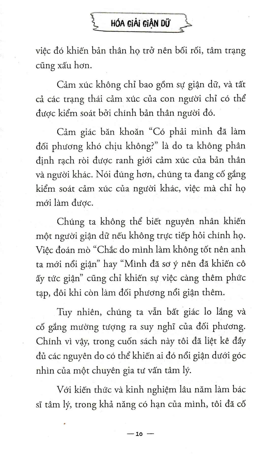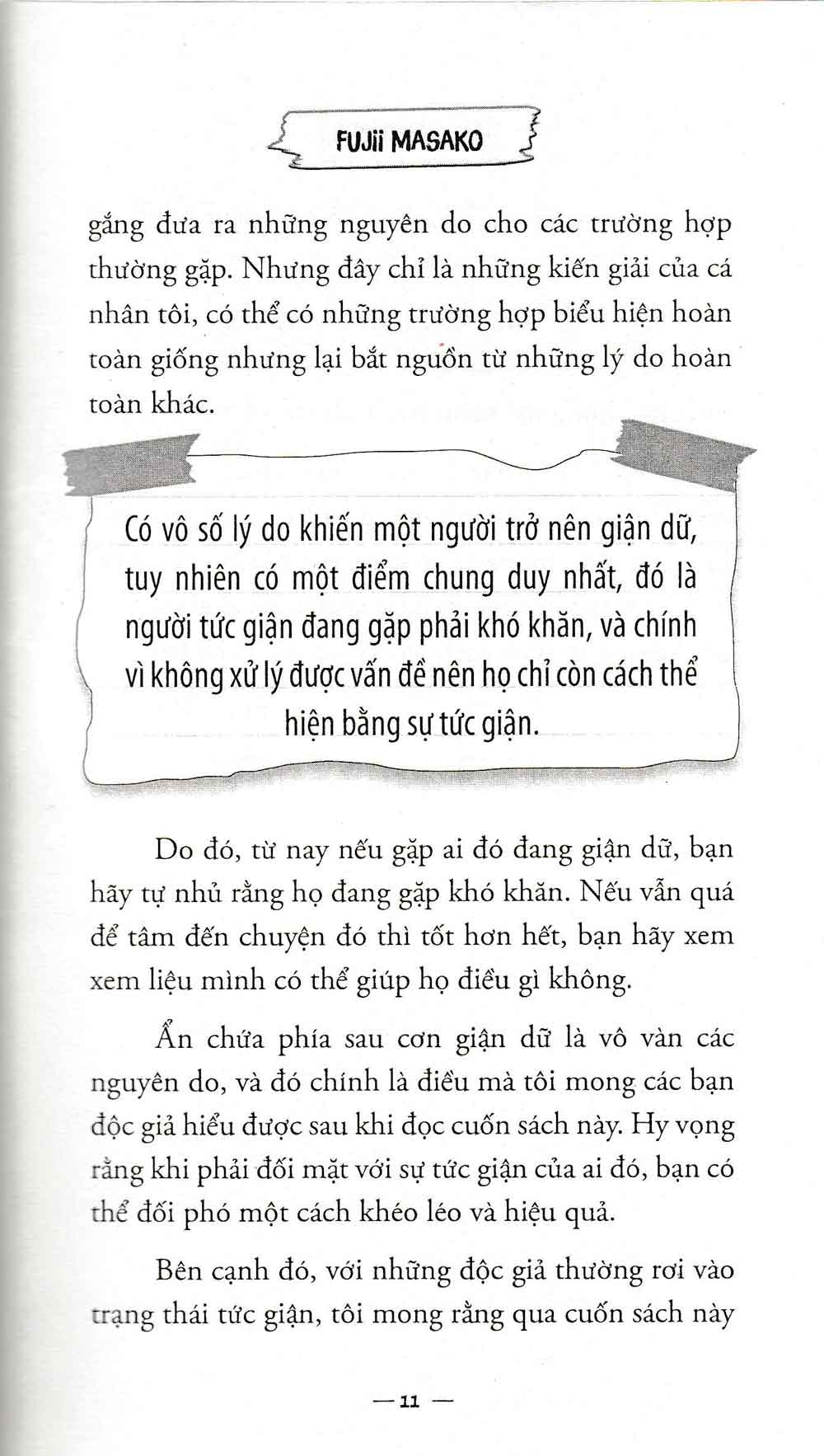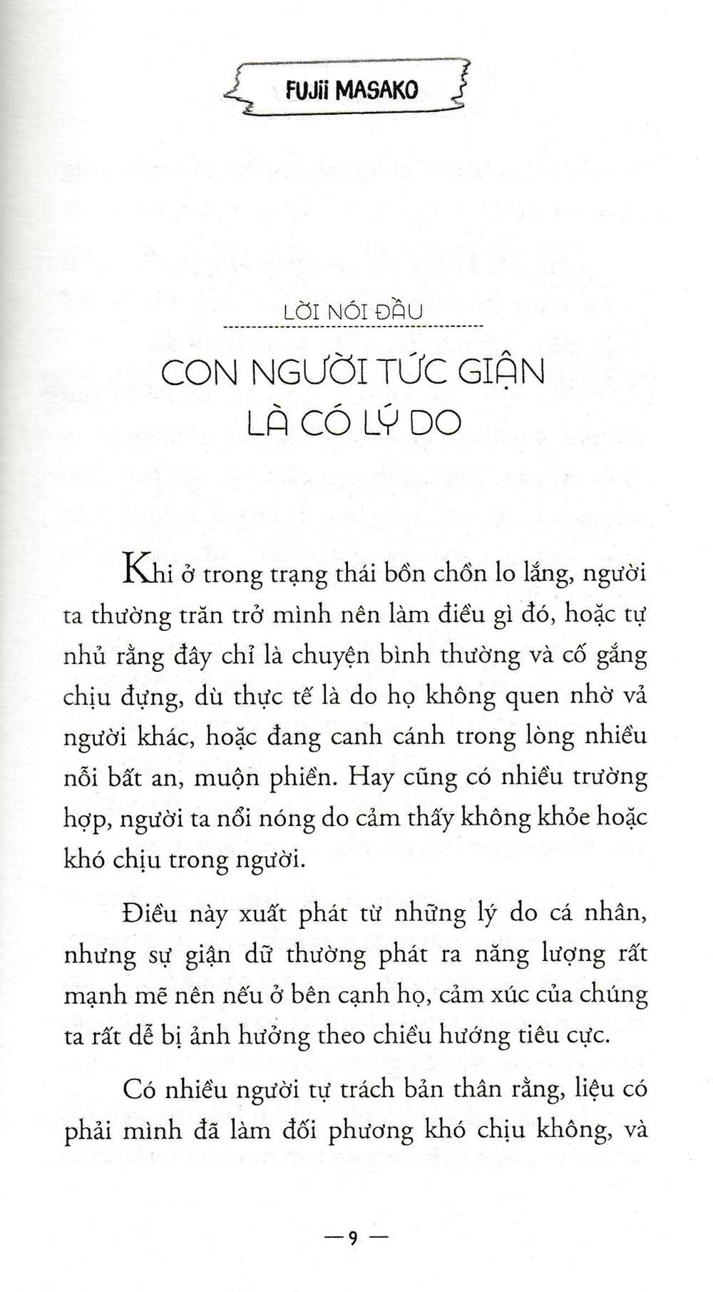 - Những phiền phức trong cuộc sống thường nhật Mỗi ngày một người bình thường dường như phải đối mặt với rất nhiều những cơn giận dữ từ nhiều nguồn khác nhau. Rất may trong cuốn sách này, bác sĩ tâm lý Fujii Masako sẽ chỉ ra cho độc giả cách thức hóa giải những giận dữ mà bạn có thể phải đối mặt. Tác giả Fujii Masako cho biết có vô số lý do khiến một người trở nên giận dữ, tuy nhiên có một điểm chung duy nhất, đó là người tức giận đang gặp phải khó khăn, và chính vì không xử lý được vấn đề nên họ chỉ còn cách thể hiện bằng sự tức giận. Do đó, từ nay nếu gặp ai đó đang giận dữ, bạn hãy tự nhủ rằng họ đang gặp khó khăn. “Tôi là tôi. Bạn là bạn”. Nếu chúng ta có thể phân biệt rạch ròi ranh giới giữa bản thân và người khác thì việc chúng ta bị cảm xúc của họ chi phối, hoặc trút giận lên người khác chắc chắn sẽ giảm đáng kể. Nếu vẫn quá để tâm đến chuyện đó thì tốt hơn hết, bạn hãy xem xem liệu mình có thể giúp họ điều gì không. Ẩn chứa phía sau cơn giận dữ là vô vàn các nguyên do, và đó chính là điều mà tác giả cuốn sách cung cấp cho độc giả trong cuốn sách này. Hy vọng rằng khi phải đối mặt với sự tức giận của ai đó, bạn có thể đối phó một cách khéo léo và hiệu quả .