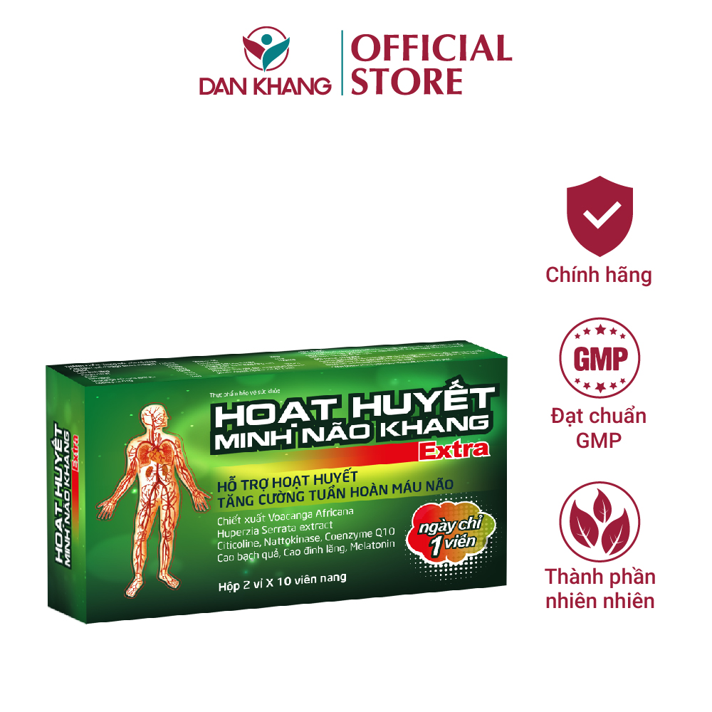 HOẠT HUYẾT MINH NÃO KHANG EXTRA HỘP 3 VỈ X 10 VIÊN Hoạt Huyết Minh Não Khang được bào chế từ các dược liệu thuộc nhóm bổ huyết có tác dụng tuần hoàn máu tới